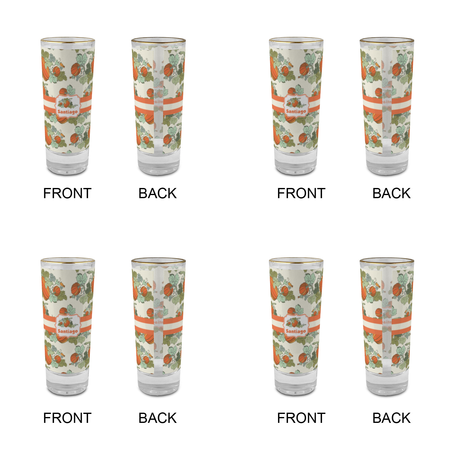 These glass shooter glasses are printed in full color with the design of your choice. These are a tall shooter 2 oz size and stand 4" tall. The print is a full wrap design to boldly display your personalization.