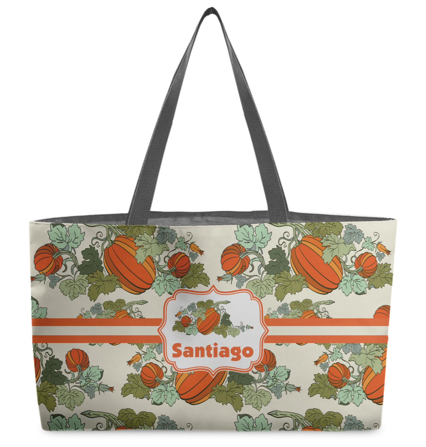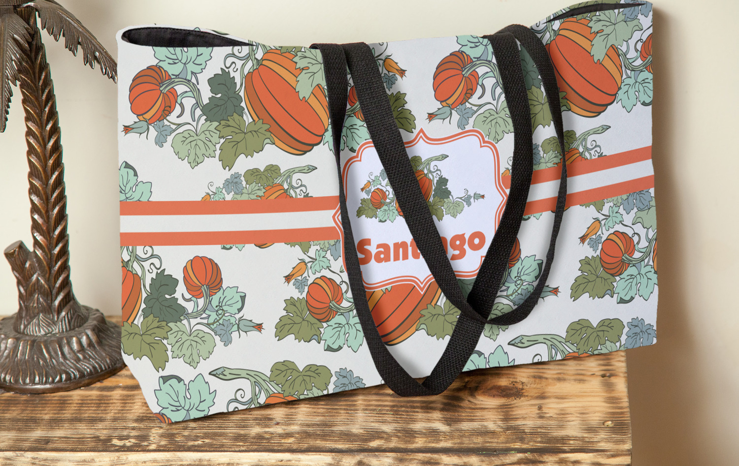 These beach totes are handmade here in the USA. Fabric is printed with your design. The tote is then sewn from the fabric pieces, lining and handles added.
