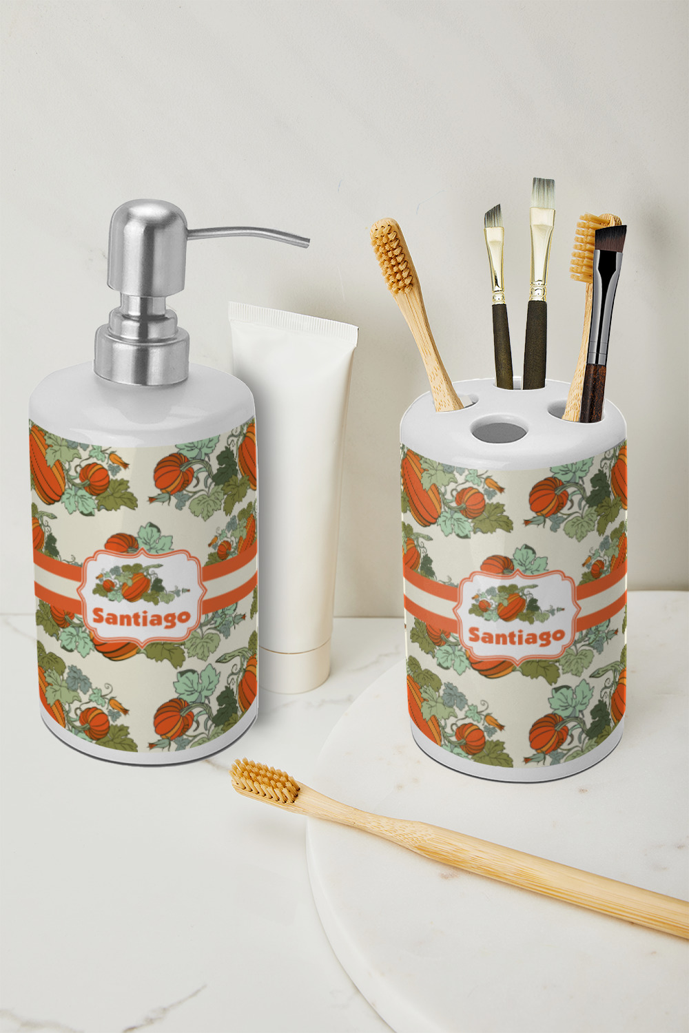 This two piece, ceramic bathroom set will add the perfect splash of color to any bathroom. This set includes one pump dispenser, ideal for soap or lotion, and one toothbrush holder with four holes. Although originally designed for toothbrushes, the holder will also hold make-up brushes, nail files, and other bathroom tools.