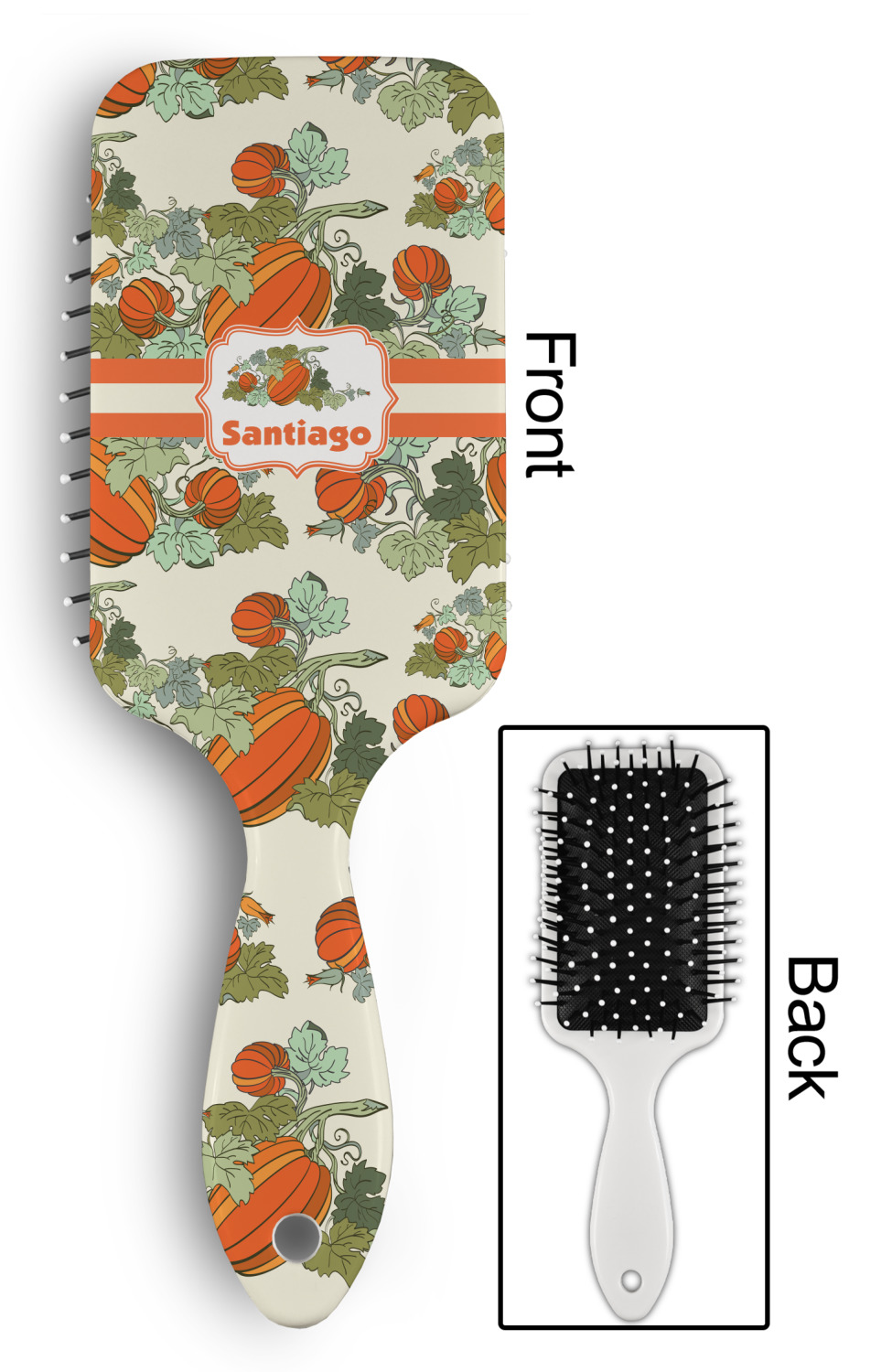 Your designed is printed on the front of the brush.; The back handle and sides are white.