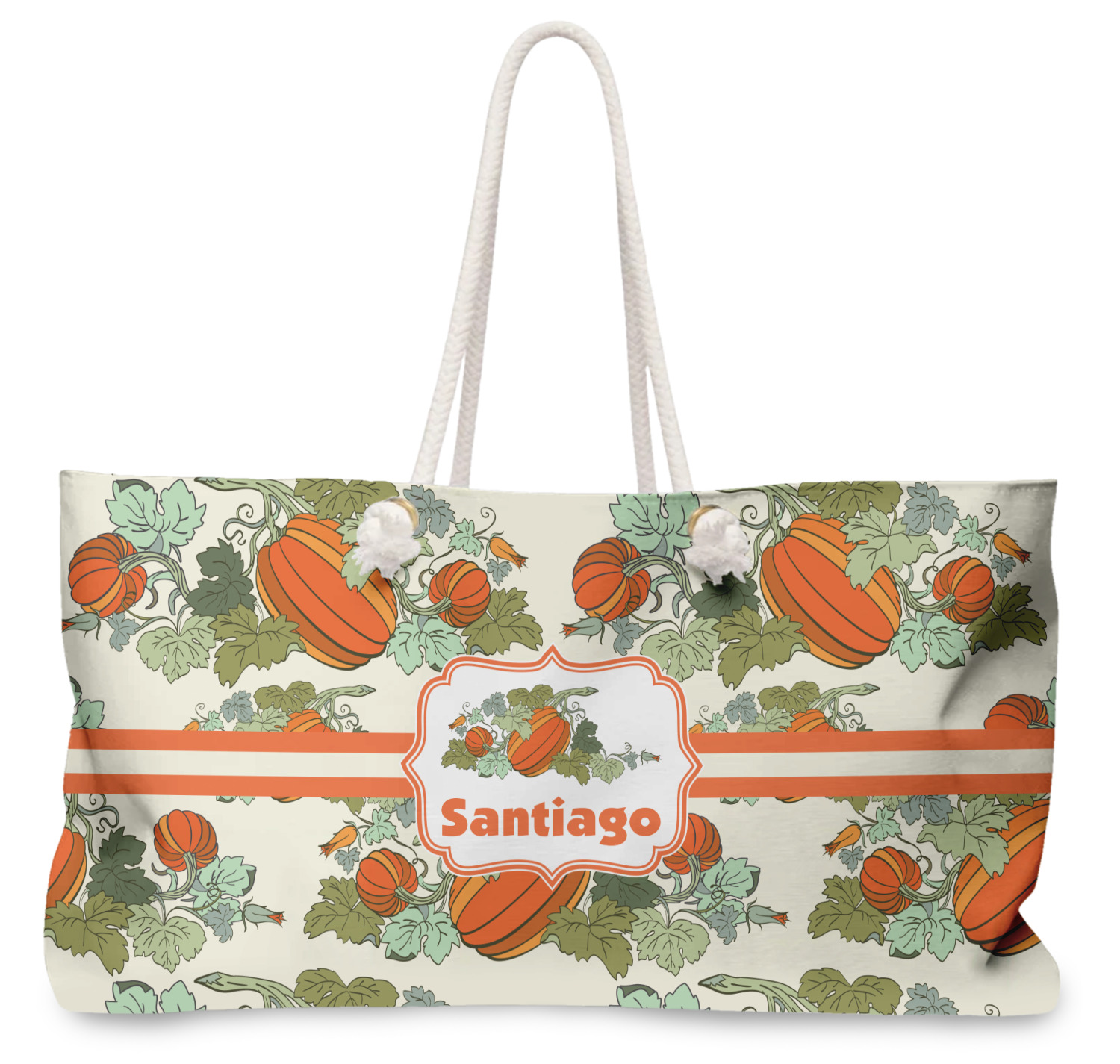 Our oversized weekender tote with rope handles is perfect for your weekend at the beach or on the town. This large tote are 24" W X 13" H, with a 5" gusset and a 27" thick rope handles with a knot that is put through a grommeted brass hole.