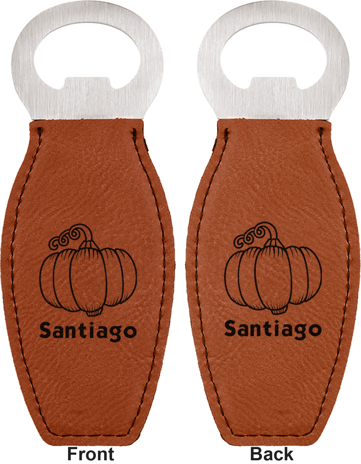 Built from stainless steel, these custom bottle openers are wrapped in a cognac-colored leatherette. Sharp, black stitching lines the edges for extra durability and a finished touch. Your personalization is laser-engraved onto the surface of this leatherette, leaving behind a crisp, black coloration. At 4.6 by 1.8 inches, this beer bottle opener gives you much of leverage when trying to open a stubborn bottle. On the opposite end of the opener, you'll find a magnet that you can use to display your new, unique bottle opener!
