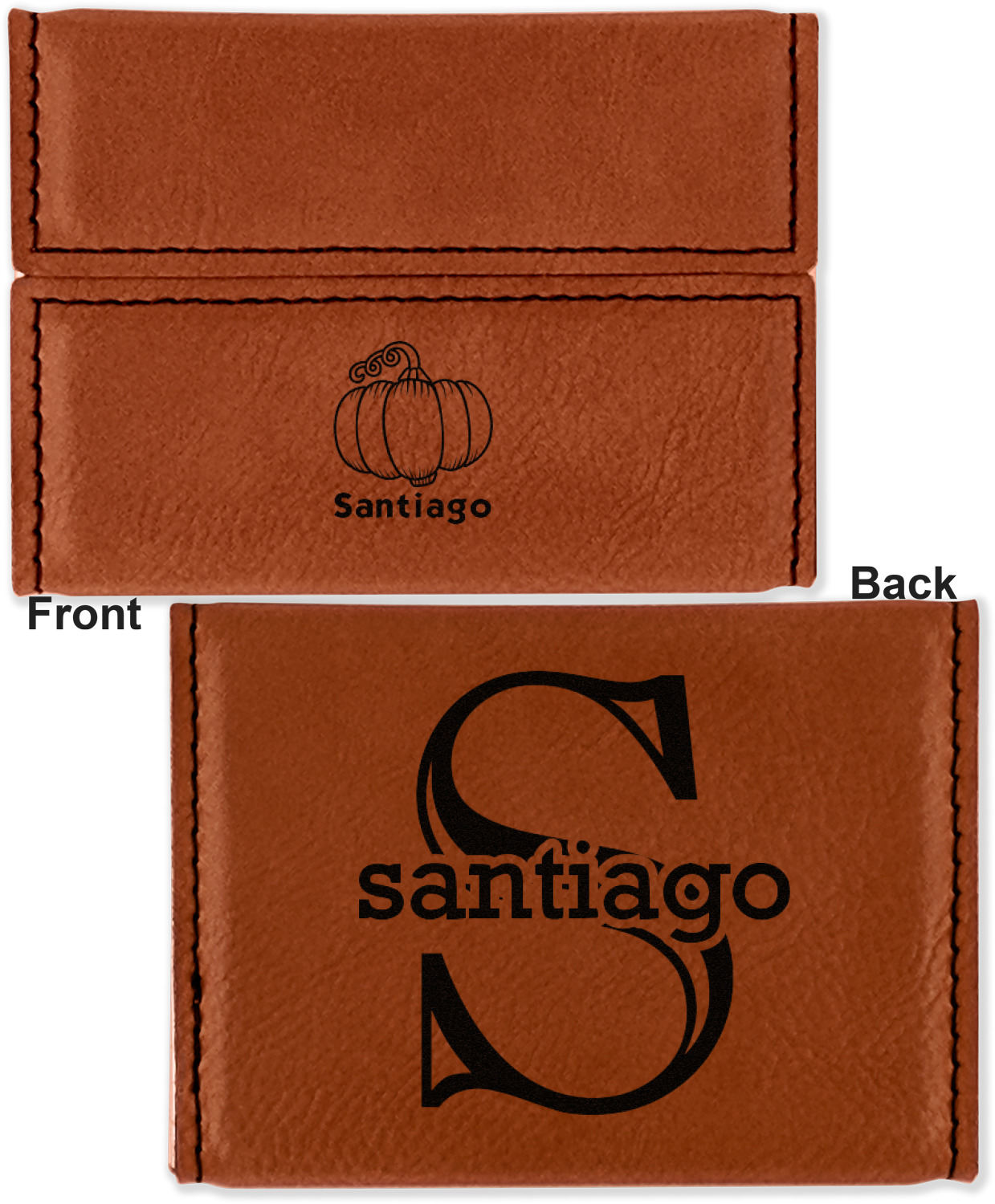 Your personalized design is laser engraved onto either the front, or the front and back of the card holder, depending on the model you purchase. Once engraved, the design will appear a darkened black against the cognac color of the leatherette.
