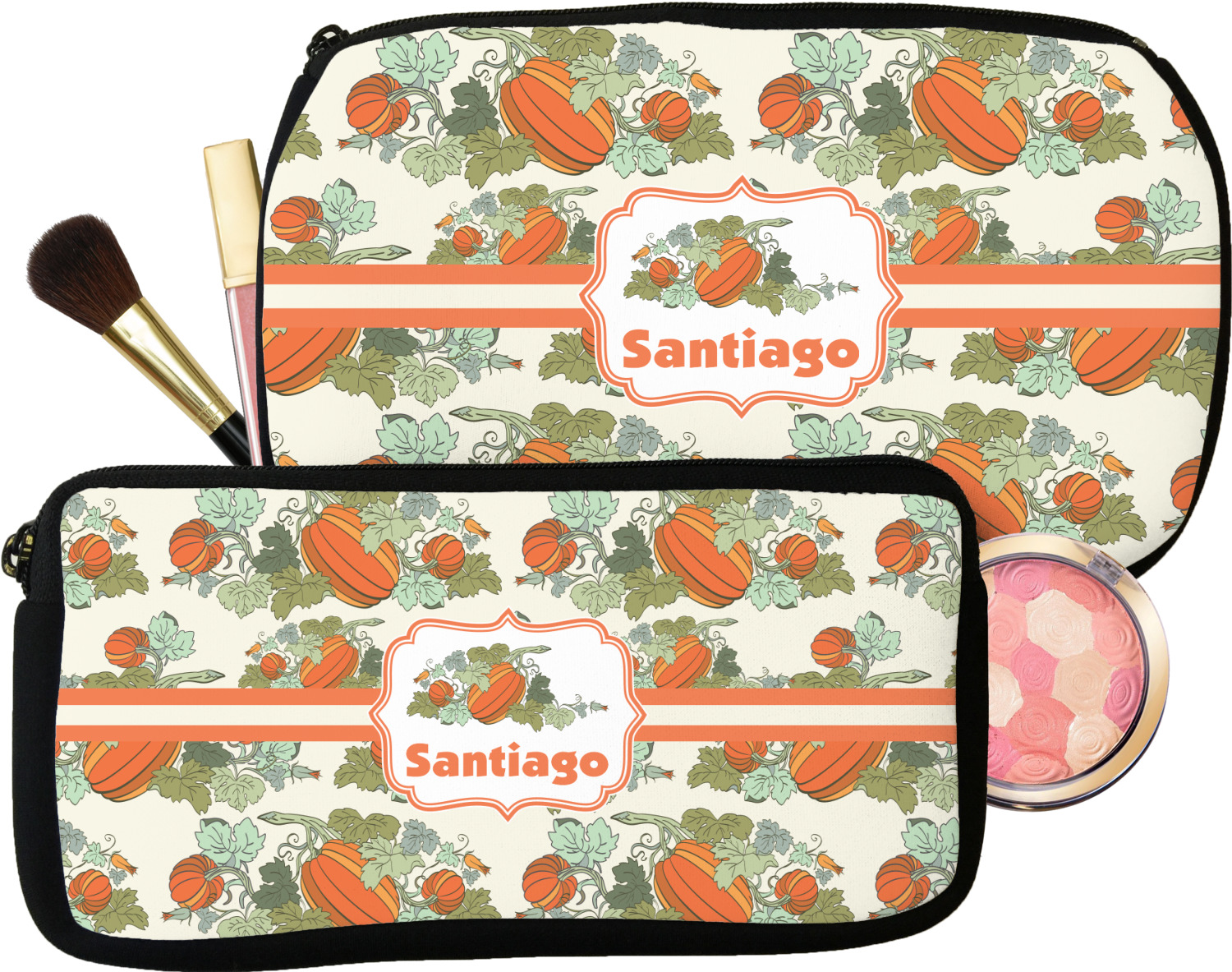 Our personalized makeup bags are available in many different designs, patterns and colors - so you are sure to find one that will love. They are made of neoprene (same material as wet-suits) and thus are water resistant, so spillages in your makeup bag will not end up all over you purse. They are customized on one side and are black on the other side and the zipper is black as well.