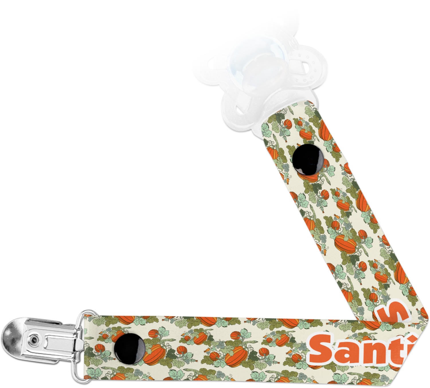 This personalized pacifier clip is the ideal size and measures at approximately 7.5 inches in length, when either end is snapped closed. On one end, you'll find a snap button. This button of your baby's pacifier holder is what can be attached to their pacifier to hold is securely in place. Simply open the snap, slip it through the pacifier opening, and snap it back into place. On the opposite end of this baby pacifier holder, you'll find a metal clip that can secure to a baby's collar or sleeve. This clip ensures that the strap stays in place, and that your baby's pacifier is always on hand.