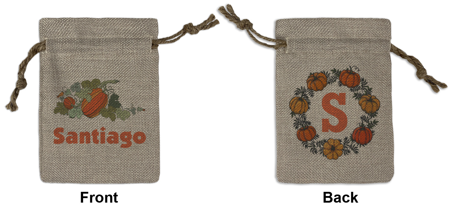 We sell our Burlap Gift Bags in 3 variant sized bags. Made with burlap polyester, each personalized bag can be secured with a twine drawstring pull. Your custom design is available to print on one side or both sides - completely up to you! The sizes of the bags measure approximately 4.5" x 6.5" for the smallest size, 6.5" x 8.0" for the medium size, and 6.5" x 13.5" for the large-sized bag.