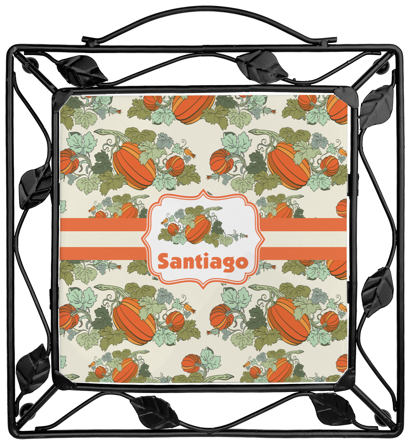 Our square trivets are made from a durable, wrought iron. This model features 4 small half circles, one on each corner, and a larger ring of iron that circles the central, customized tile. Each of the 4 corners has a round foot on its bottom for stability. This trivet is 8.75 by 8.75 inches, but the central tile measures at 6 inches on both sides.