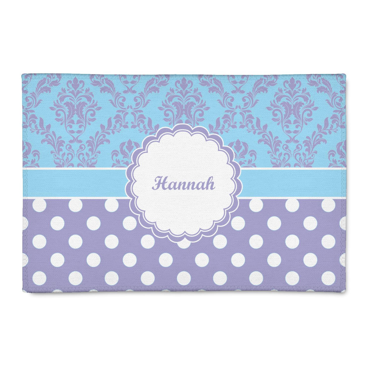 Here is a wonderful damask design with a fun, modern twist. The top of this design features a blue and purple elegant damask. The bottom features a classic design of purple with white polka dots. The two make an adorable combination. The design is completely re-color-able - so you can change any of of the colors and choose from the many many colors in our customization system.