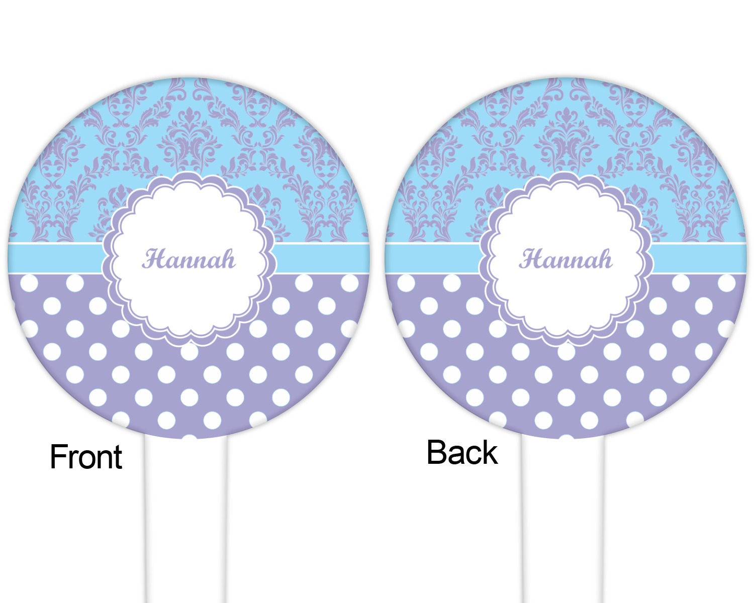 We chose a white & purple scalloped circle label on a baby blue ribbon highlights the name personalization.