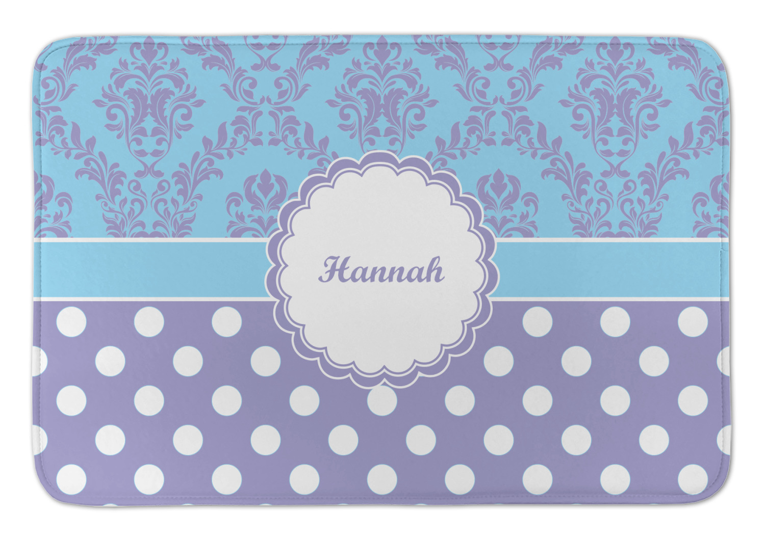 Here is a wonderful damask design with a fun, modern twist. The top of this design features a blue and purple elegant damask. The bottom features a classic design of purple with white polka dots. The two make an adorable combination. The design is completely re-color-able - so you can change any of of the colors and choose from the many many colors in our customization system.