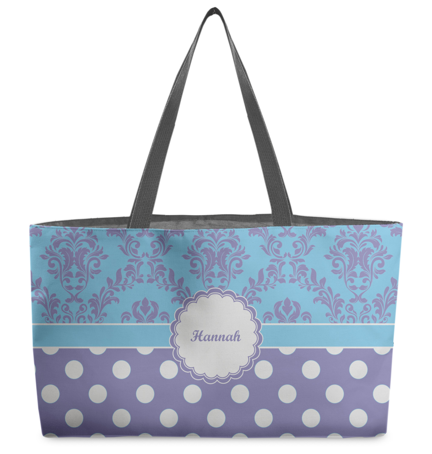 These beach totes are handmade here in the USA. Fabric is printed with your design. The tote is then sewn from the fabric pieces, lining and handles added.