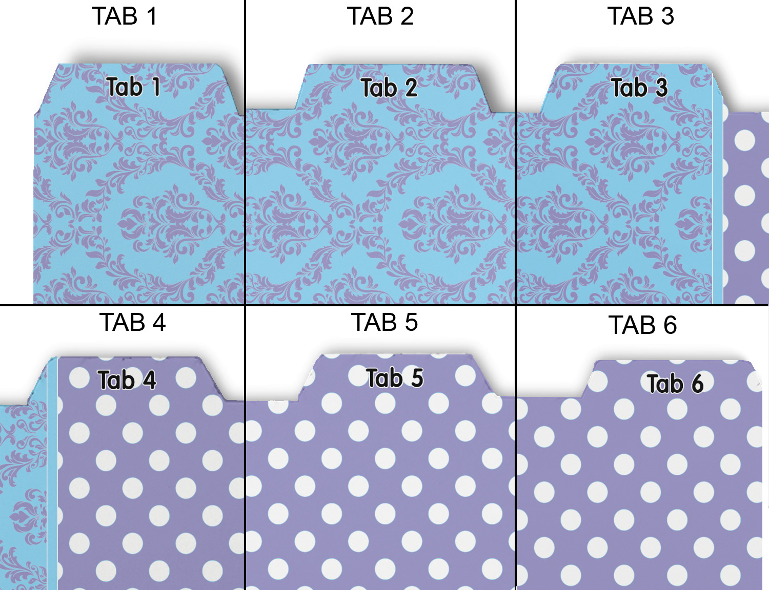 Whether you use binders at school or at work, we have designs to suit all of them. Available in 5 or 6 tab sets, you are sure to find a set to suit your needs. The back of each one is white and can be used to take notes, write vital information on, etc.