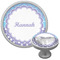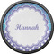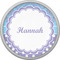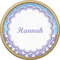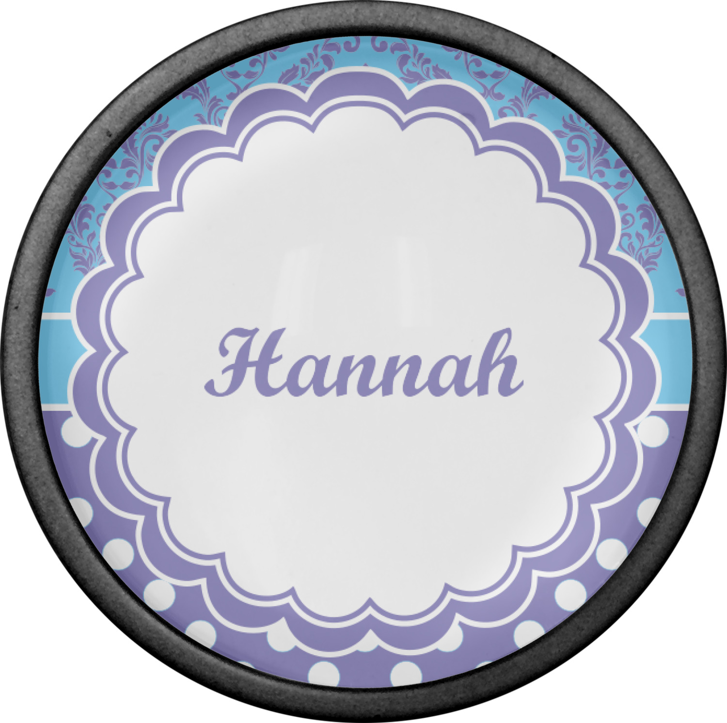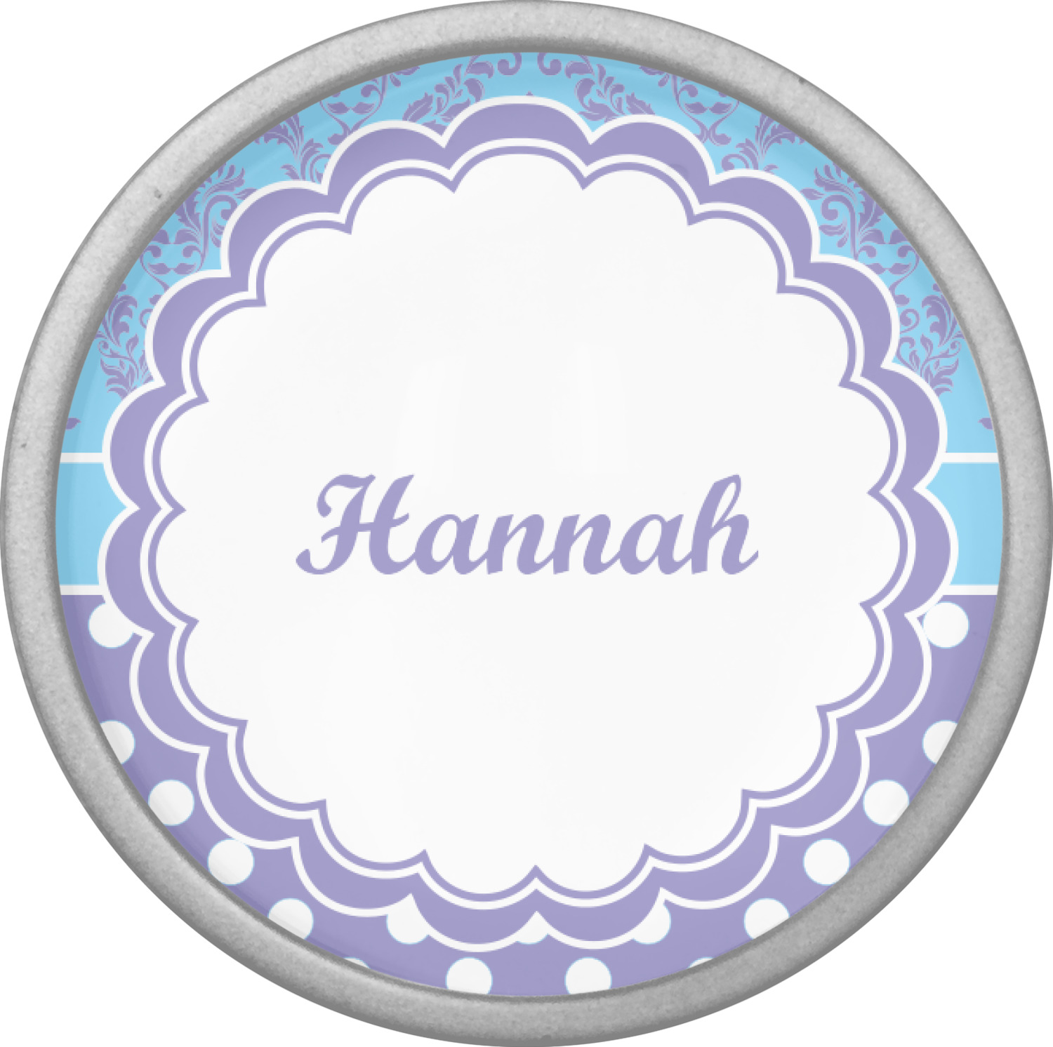 We chose a white & purple scalloped circle label on a baby blue ribbon highlights the name personalization.