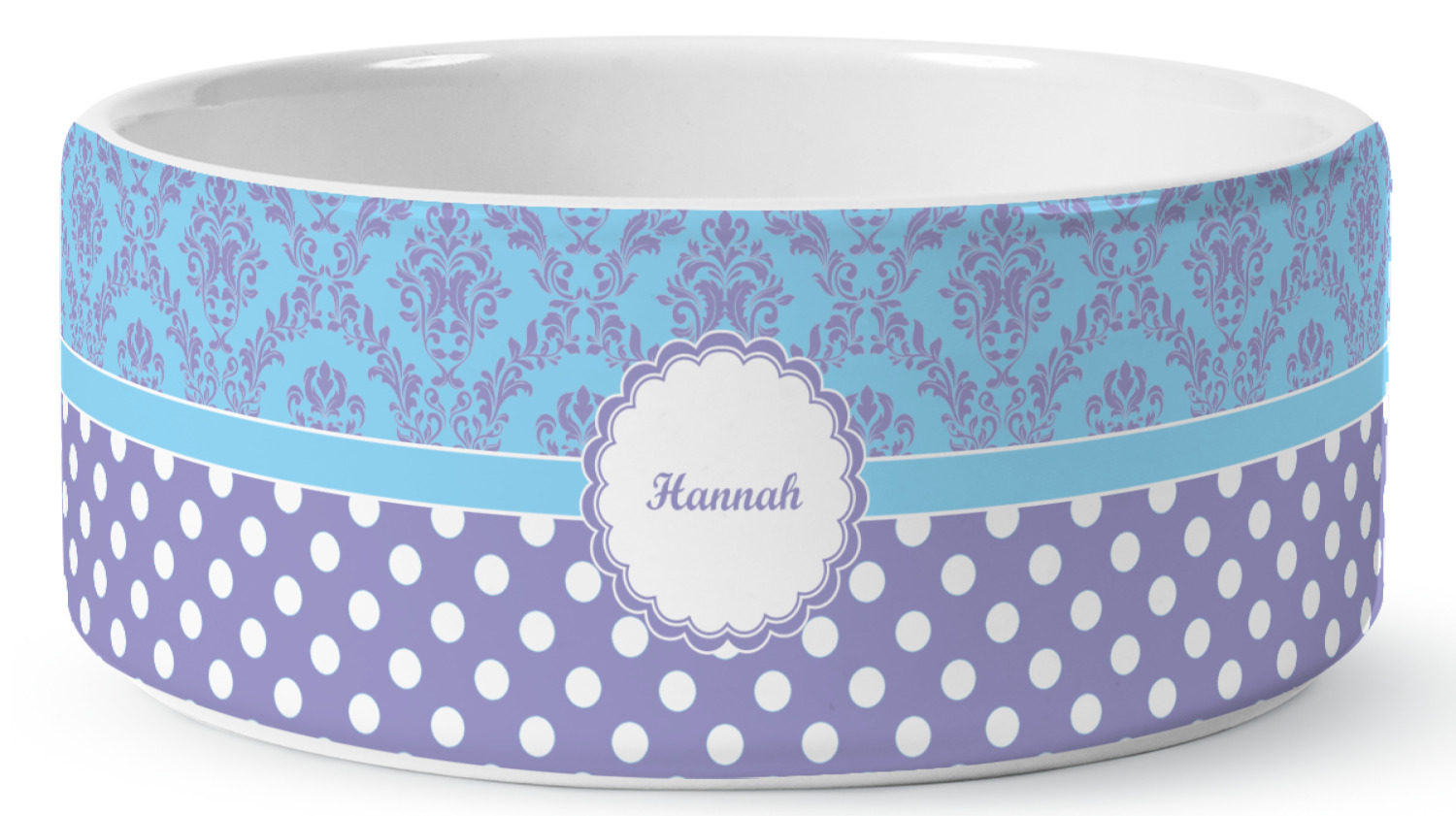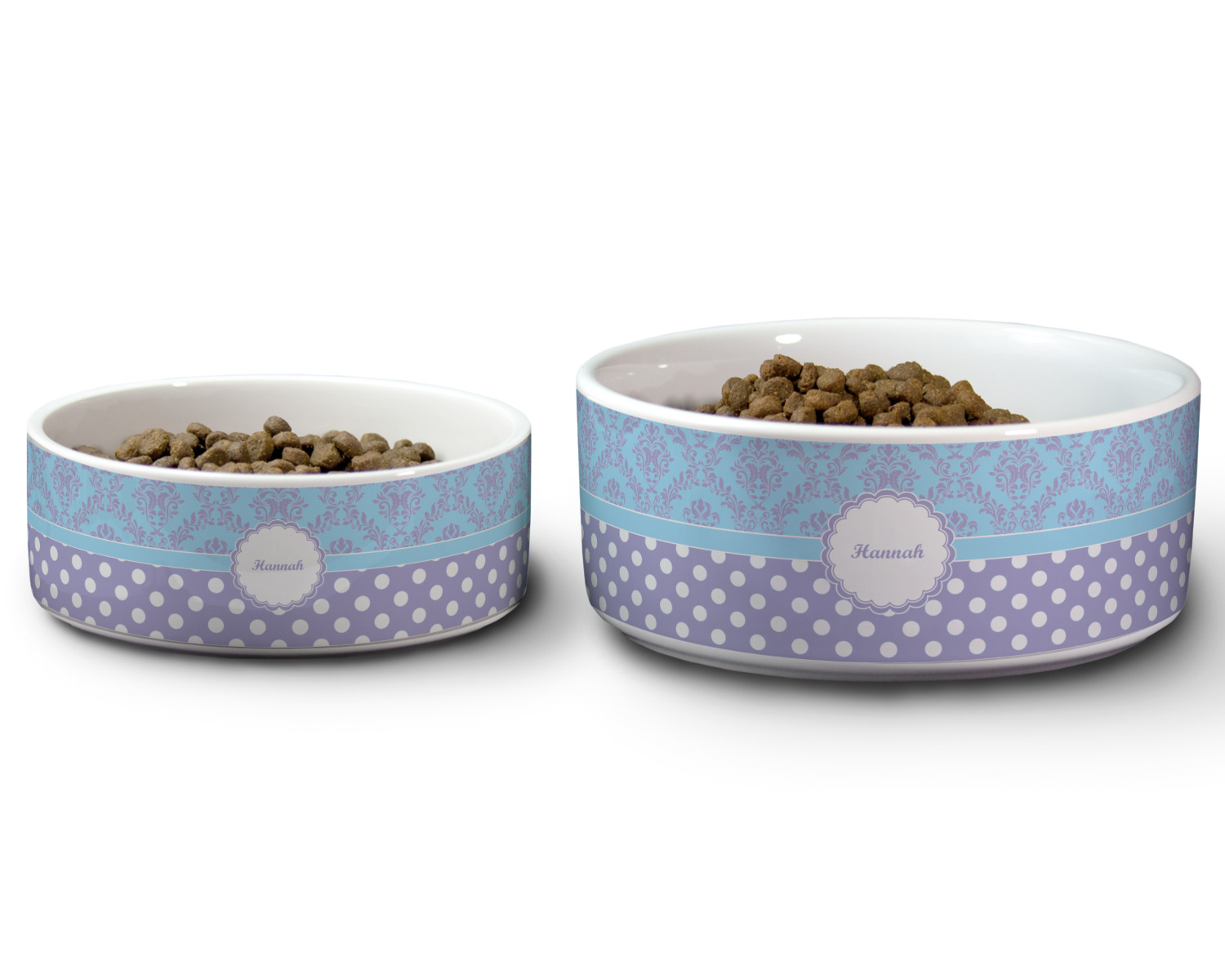 We carry these custom dog bowls in two available sizes: medium and large.The medium is 6 inches in diameter and 2.5 inches tall, and can therefore suit pets who eat up to 2.5 cups of food per meal. The large pet bowl is 7 inches in diameter and 3 inches tall, and suits pets who require up to 4.5 cups of food per meal.
