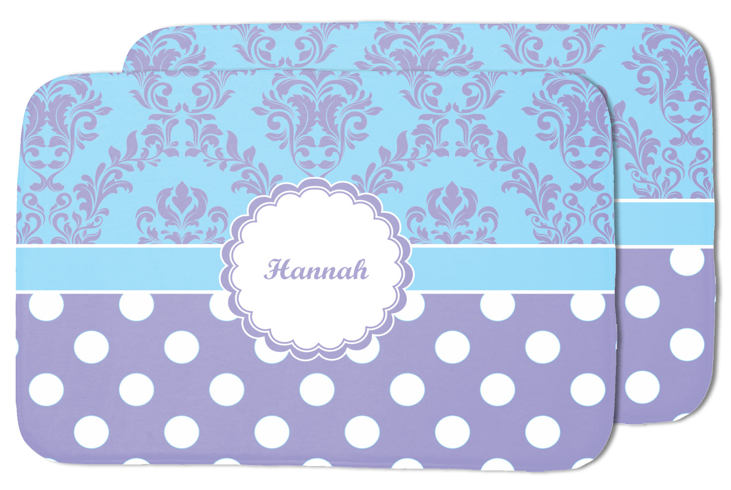 Here is a wonderful damask design with a fun, modern twist. The top of this design features a blue and purple elegant damask. The bottom features a classic design of purple with white polka dots. The two make an adorable combination. The design is completely re-color-able - so you can change any of of the colors and choose from the many many colors in our customization system.