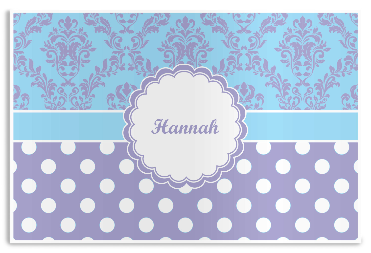 Here is a wonderful damask design with a fun, modern twist. The top of this design features a blue and purple elegant damask. The bottom features a classic design of purple with white polka dots. The two make an adorable combination. The design is completely re-color-able - so you can change any of of the colors and choose from the many many colors in our customization system.