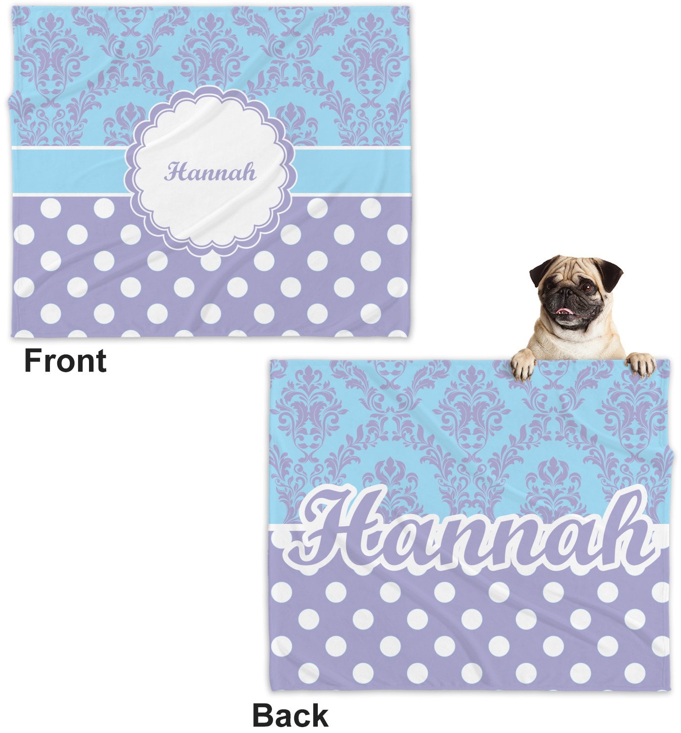 These dog blankets are crafted from a gentle, soft-to-the-touch, minky material. We print your customizations, either matching or differing, on both the top and underside of the blanket. These personalized dog blankets are available in two sizes: regular and large. Our regular size, at 40" x 30", accommodates small and some medium size dogs. At 60" x 50", our large dog blanket is a better fit for bigger breeds. Though specialized for dogs, these blankets still make a thoughtful gift for your favorite feline, or any other pet in mind!