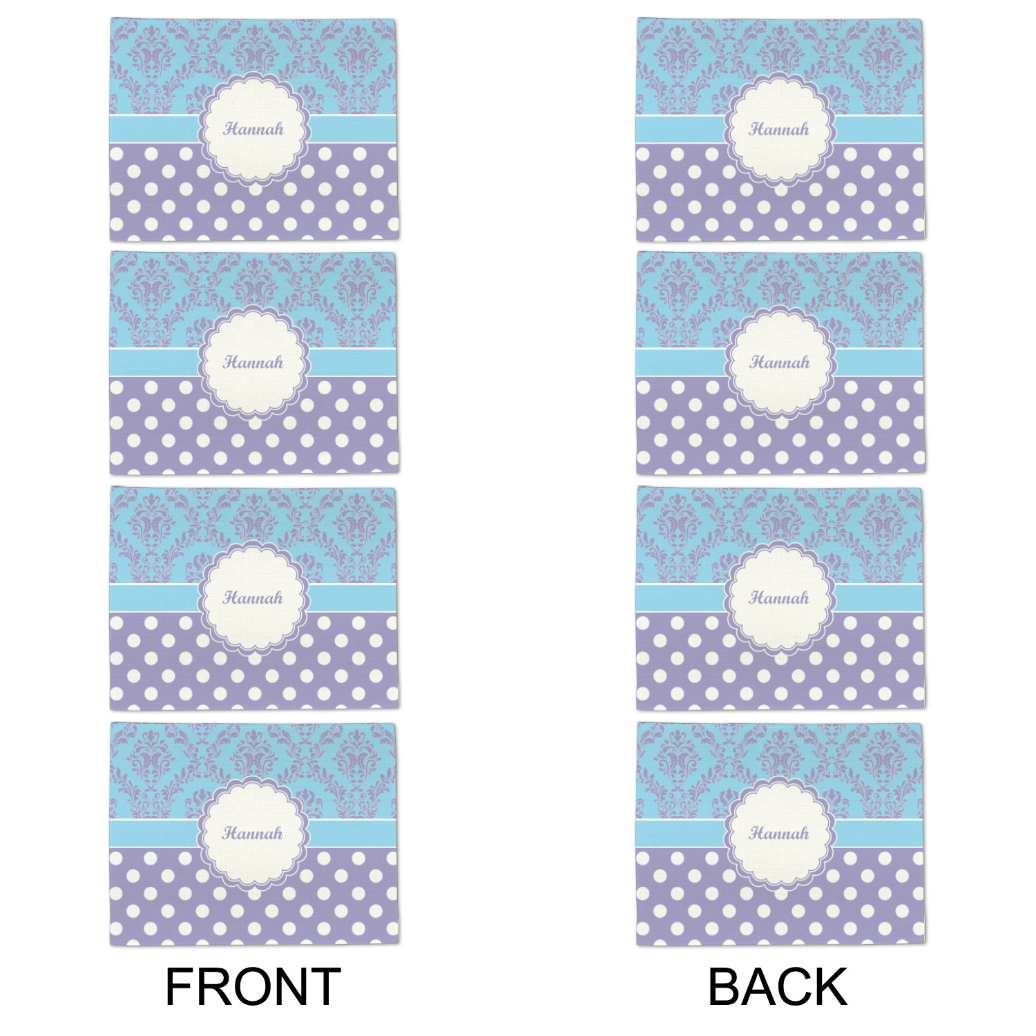 Here is a wonderful damask design with a fun, modern twist. The top of this design features a blue and purple elegant damask. The bottom features a classic design of purple with white polka dots. The two make an adorable combination. The design is completely re-color-able - so you can change any of of the colors and choose from the many many colors in our customization system.
