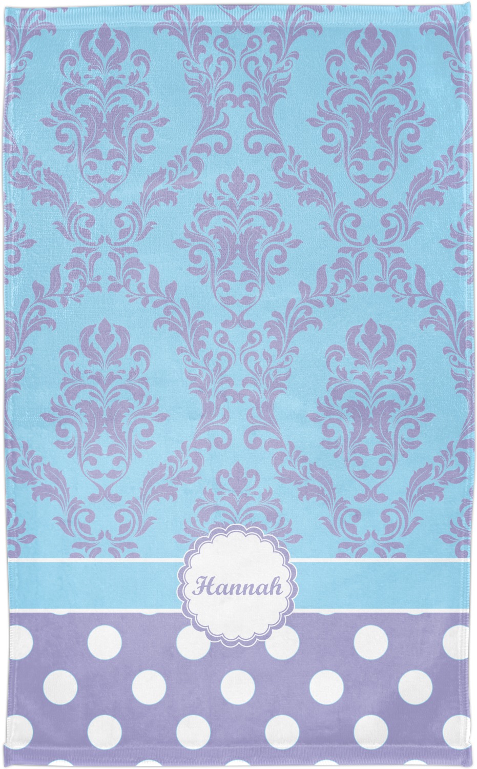 Here is a wonderful damask design with a fun, modern twist. The top of this design features a blue and purple elegant damask. The bottom features a classic design of purple with white polka dots. The two make an adorable combination. The design is completely re-color-able - so you can change any of of the colors and choose from the many many colors in our customization system.