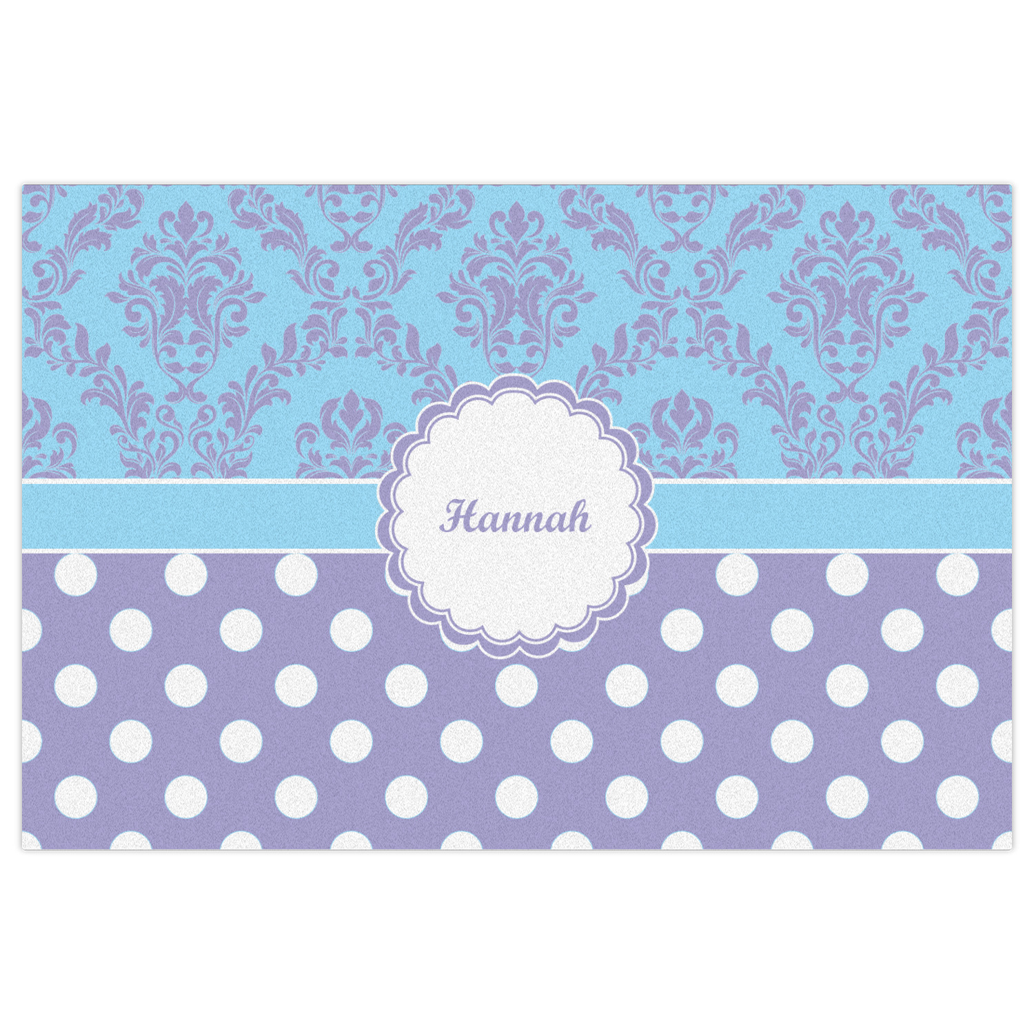 Here is a wonderful damask design with a fun, modern twist. The top of this design features a blue and purple elegant damask. The bottom features a classic design of purple with white polka dots. The two make an adorable combination. The design is completely re-color-able - so you can change any of of the colors and choose from the many many colors in our customization system.