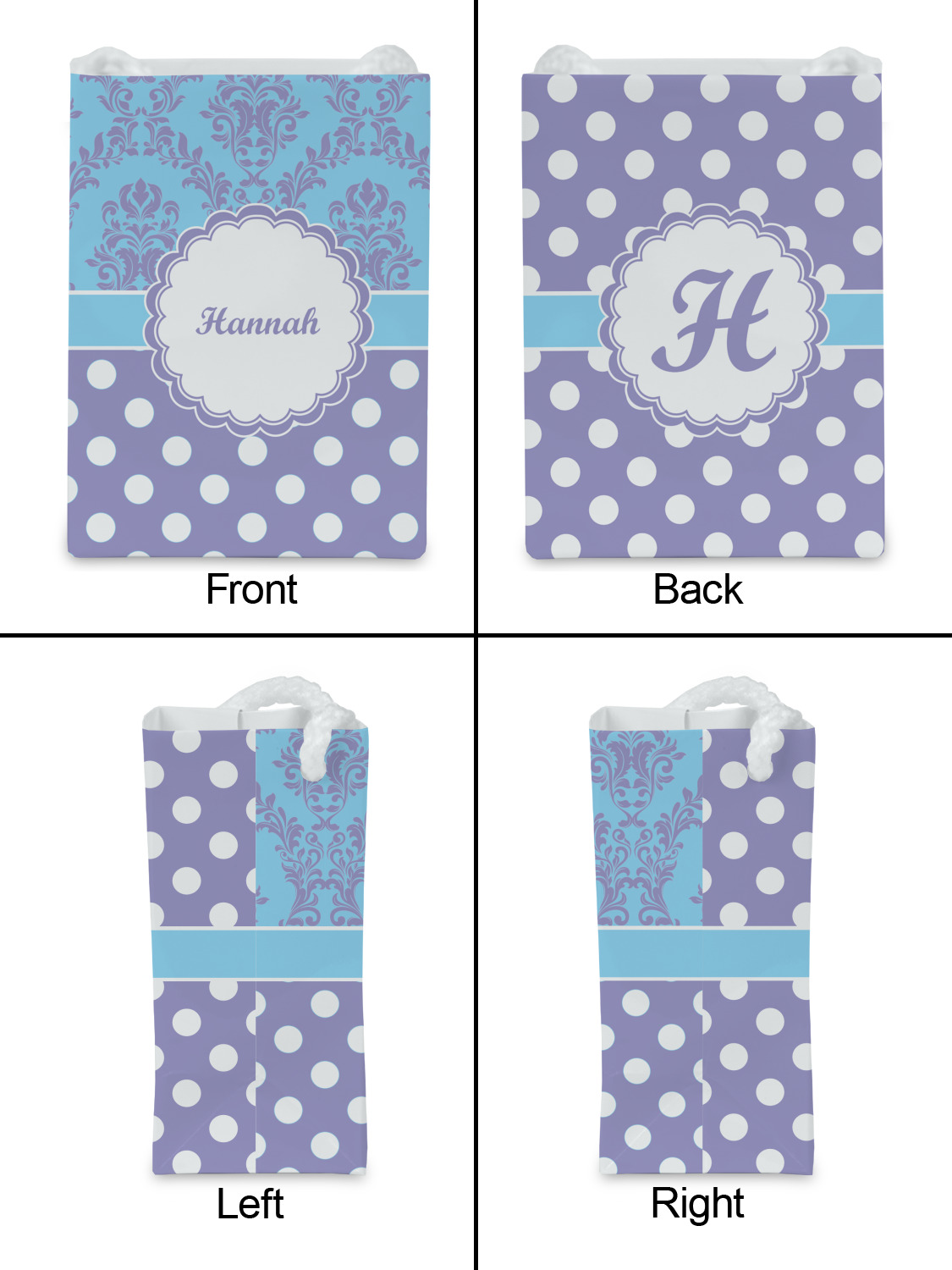 Here is a wonderful damask design with a fun, modern twist. The top of this design features a blue and purple elegant damask. The bottom features a classic design of purple with white polka dots. The two make an adorable combination. The design is completely re-color-able - so you can change any of of the colors and choose from the many many colors in our customization system.