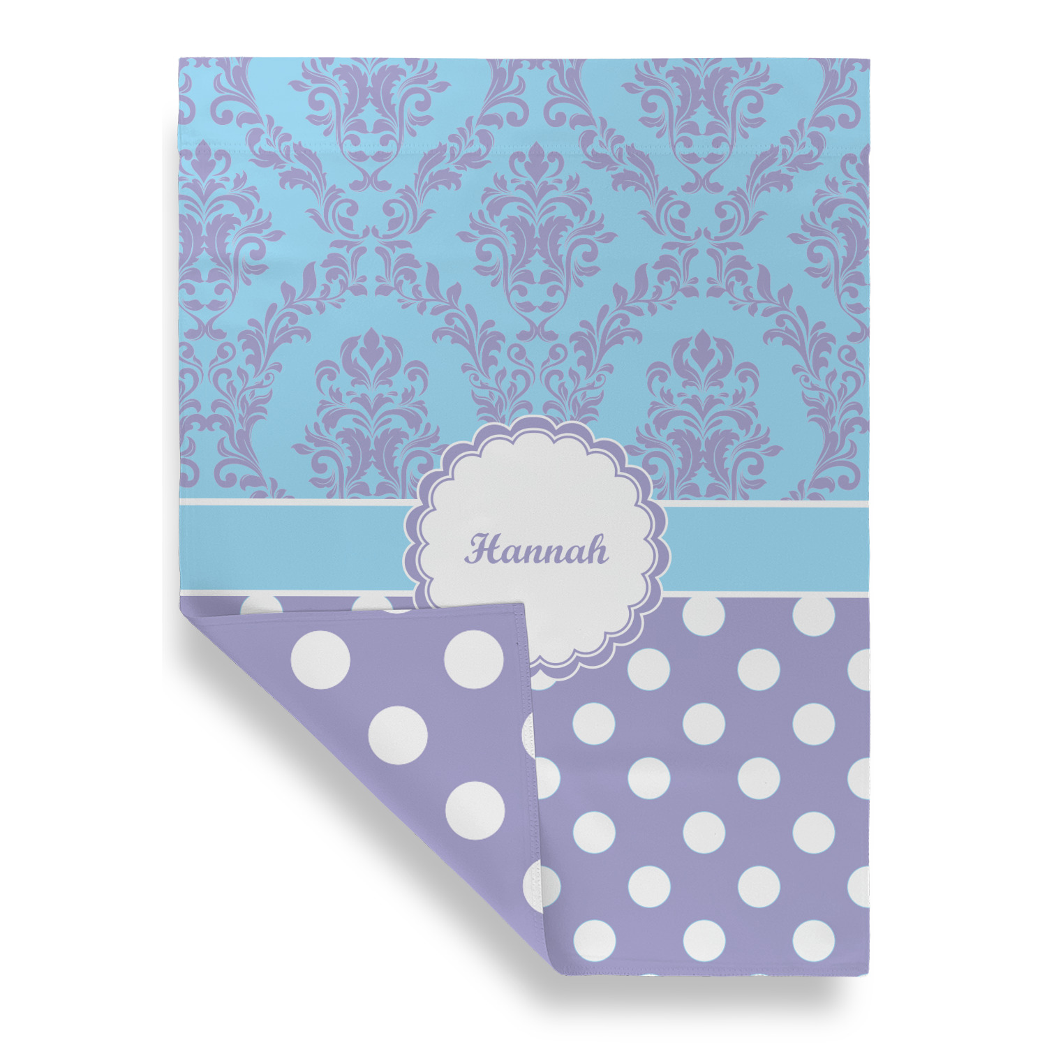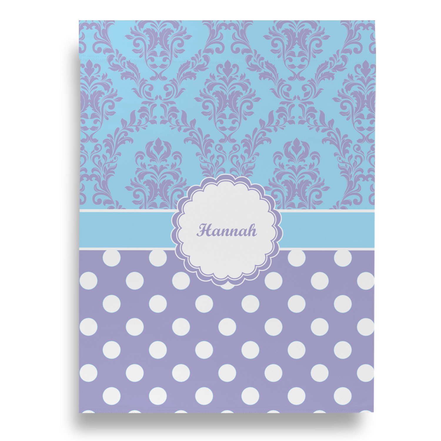 Here is a wonderful damask design with a fun, modern twist. The top of this design features a blue and purple elegant damask. The bottom features a classic design of purple with white polka dots. The two make an adorable combination. The design is completely re-color-able - so you can change any of of the colors and choose from the many many colors in our customization system.