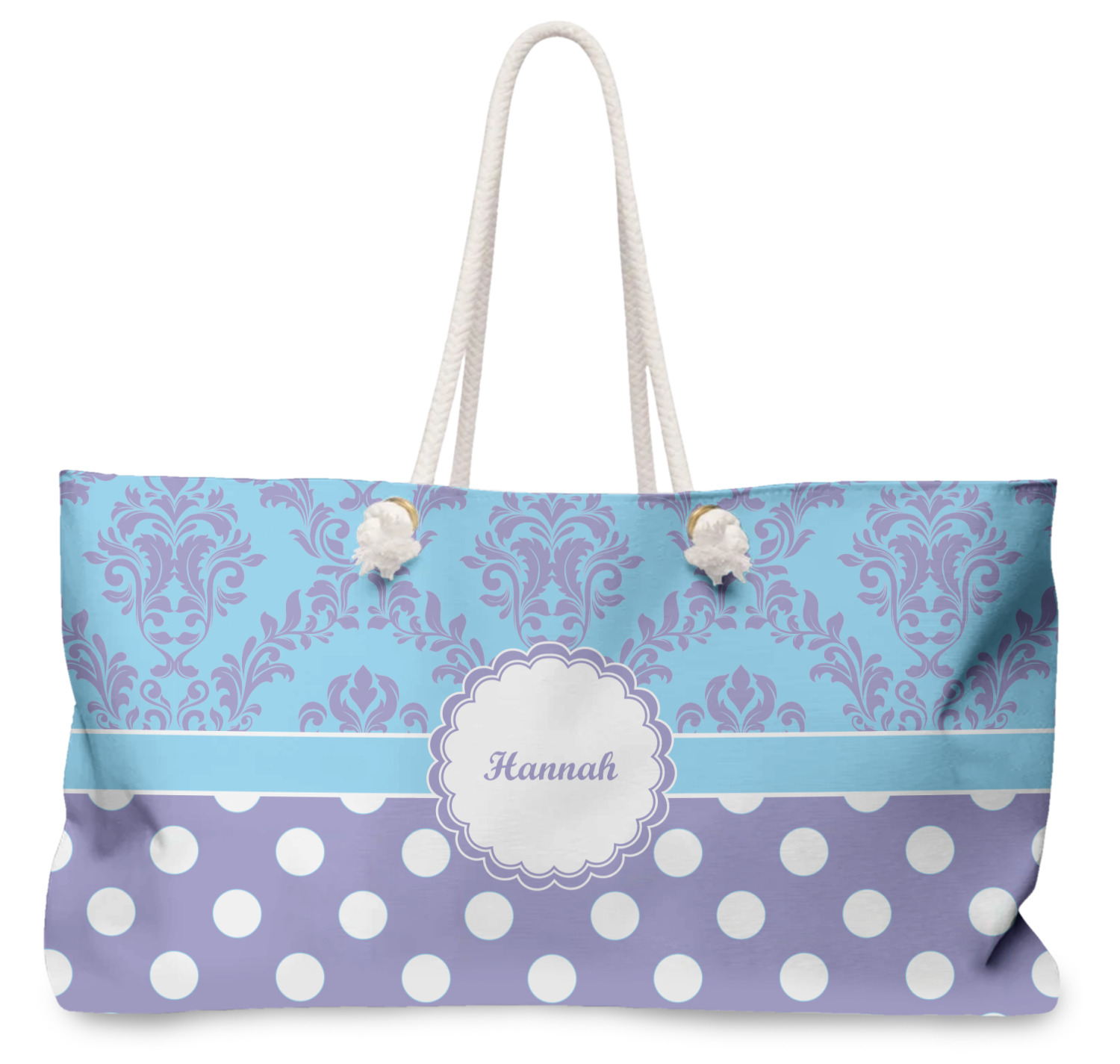 Our oversized weekender tote with rope handles is perfect for your weekend at the beach or on the town. This large tote are 24" W X 13" H, with a 5" gusset and a 27" thick rope handles with a knot that is put through a grommeted brass hole.