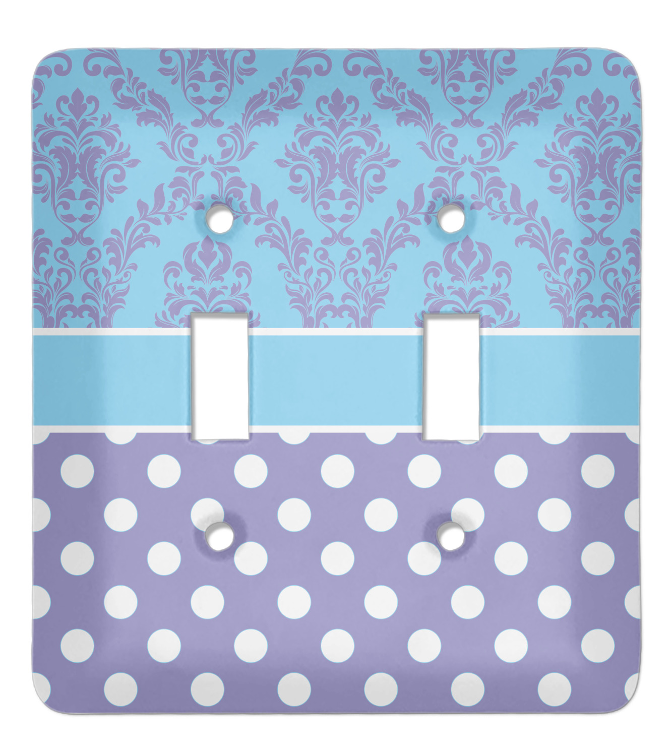 Here is a wonderful damask design with a fun, modern twist. The top of this design features a blue and purple elegant damask. The bottom features a classic design of purple with white polka dots. The two make an adorable combination. The design is completely re-color-able - so you can change any of of the colors and choose from the many many colors in our customization system.