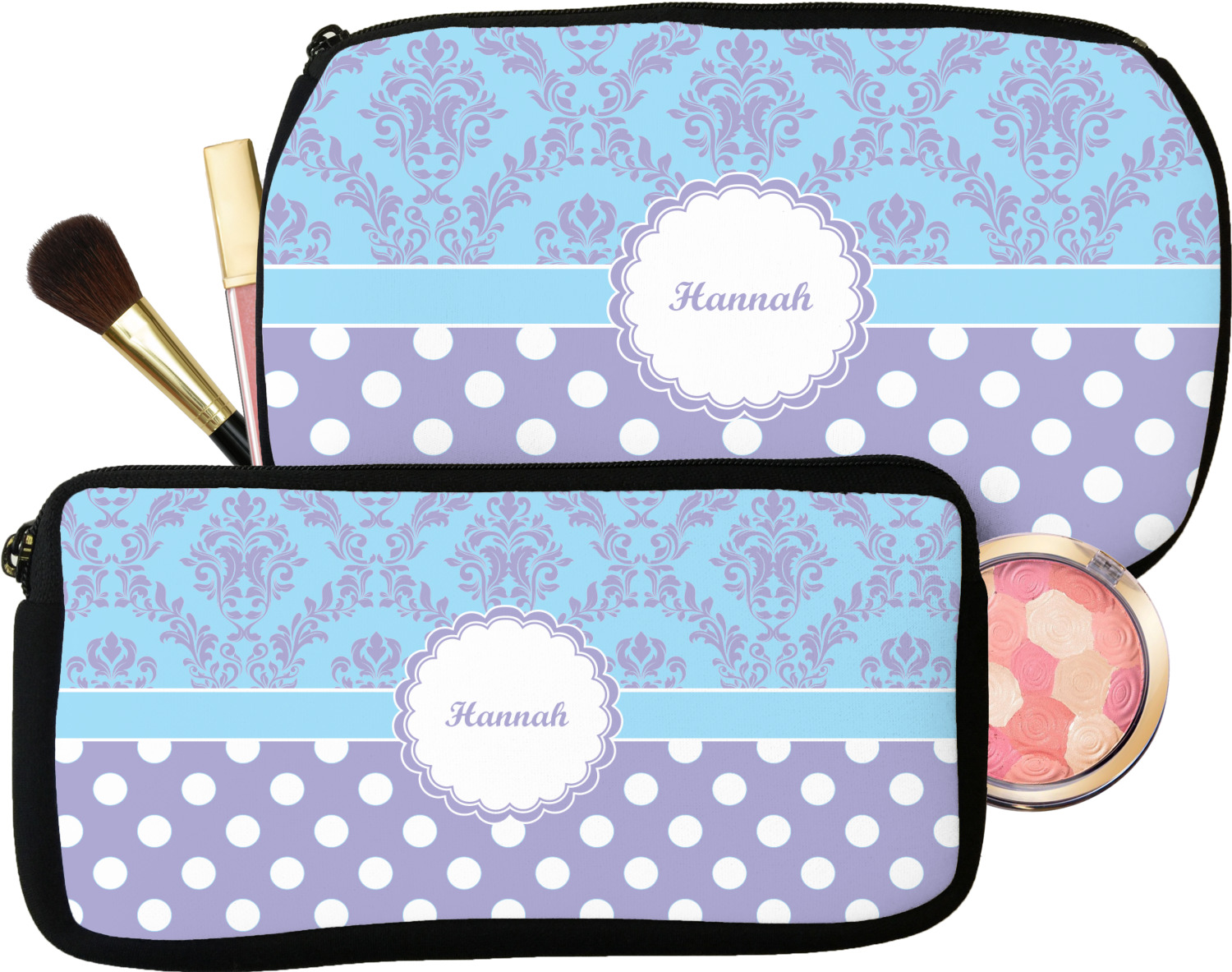 Our personalized makeup bags are available in many different designs, patterns and colors - so you are sure to find one that will love. They are made of neoprene (same material as wet-suits) and thus are water resistant, so spillages in your makeup bag will not end up all over you purse. They are customized on one side and are black on the other side and the zipper is black as well.