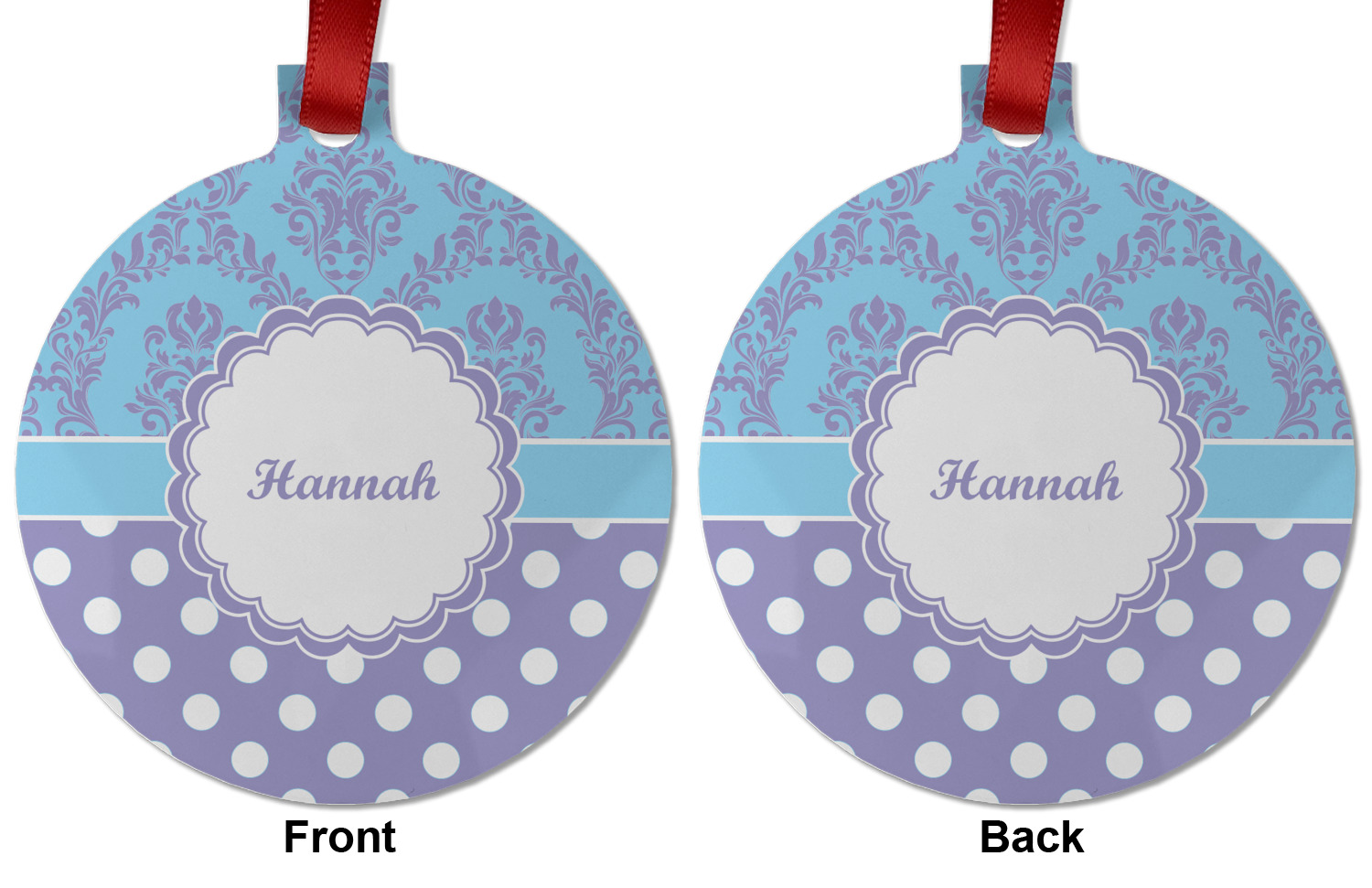 We chose a white & purple scalloped circle label on a baby blue ribbon highlights the name personalization.