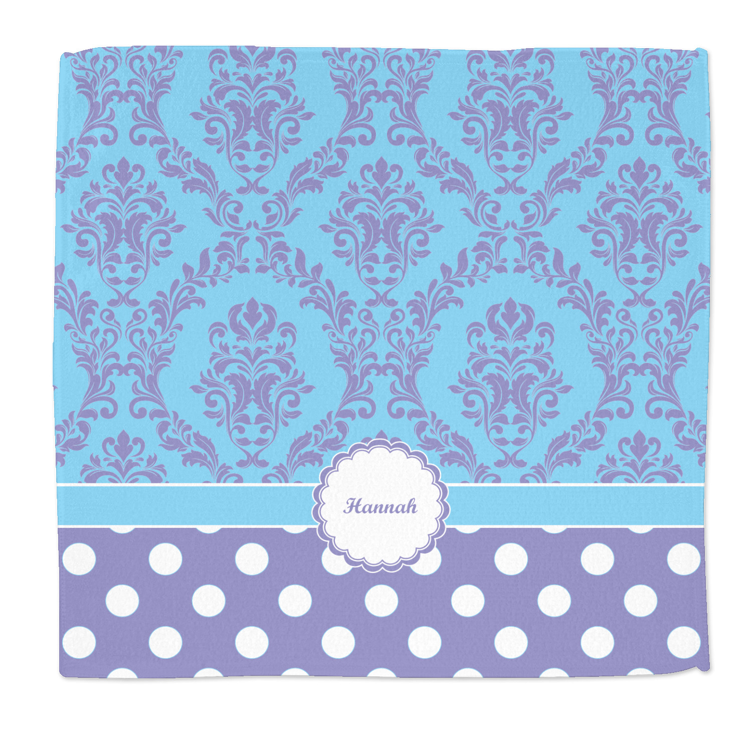 Here is a wonderful damask design with a fun, modern twist. The top of this design features a blue and purple elegant damask. The bottom features a classic design of purple with white polka dots. The two make an adorable combination. The design is completely re-color-able - so you can change any of of the colors and choose from the many many colors in our customization system.