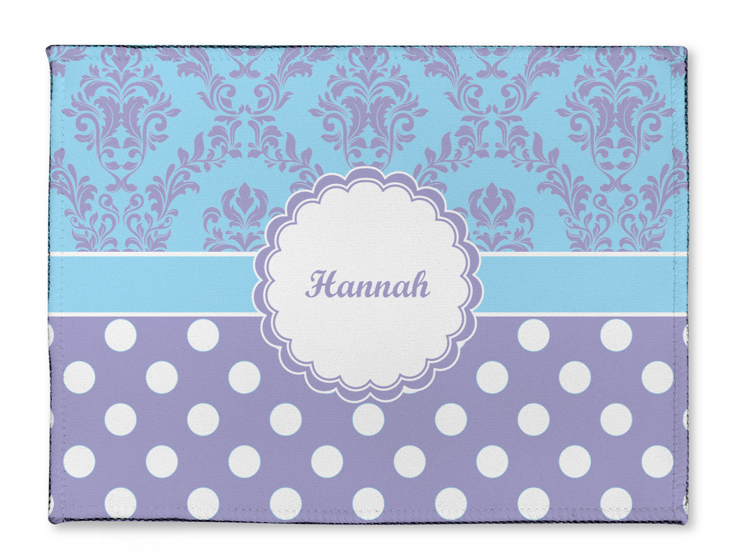Here is a wonderful damask design with a fun, modern twist. The top of this design features a blue and purple elegant damask. The bottom features a classic design of purple with white polka dots. The two make an adorable combination. The design is completely re-color-able - so you can change any of of the colors and choose from the many many colors in our customization system.