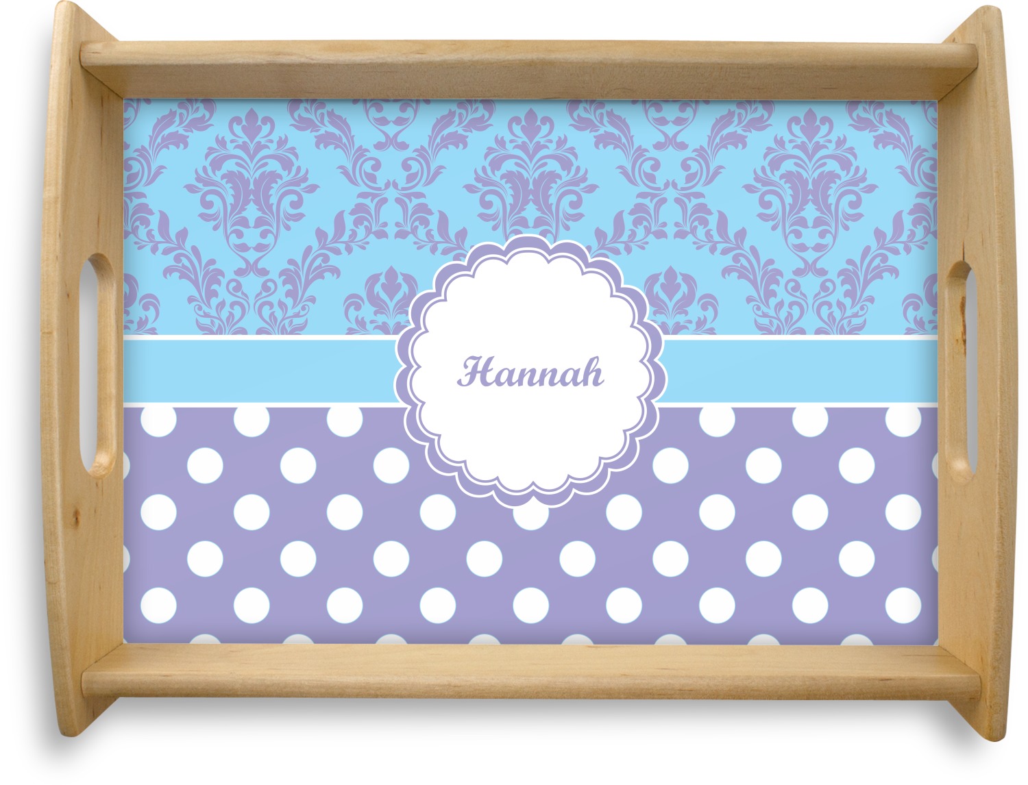This serving tray with handles features square edges and two rounded sides, creating a very modern look. Each side is fabricated from a beautifully cut, natural wood. The bottom of the interior of the tray displays your customized design in bright, vibrant color. The tray is sold in both a black color and a natural wood look. Each variation of the wood serving tray has two sizes: Small, which is 14" x 10" x 2.25", and Large, which is 19.5" x 13.5" x 2.75".