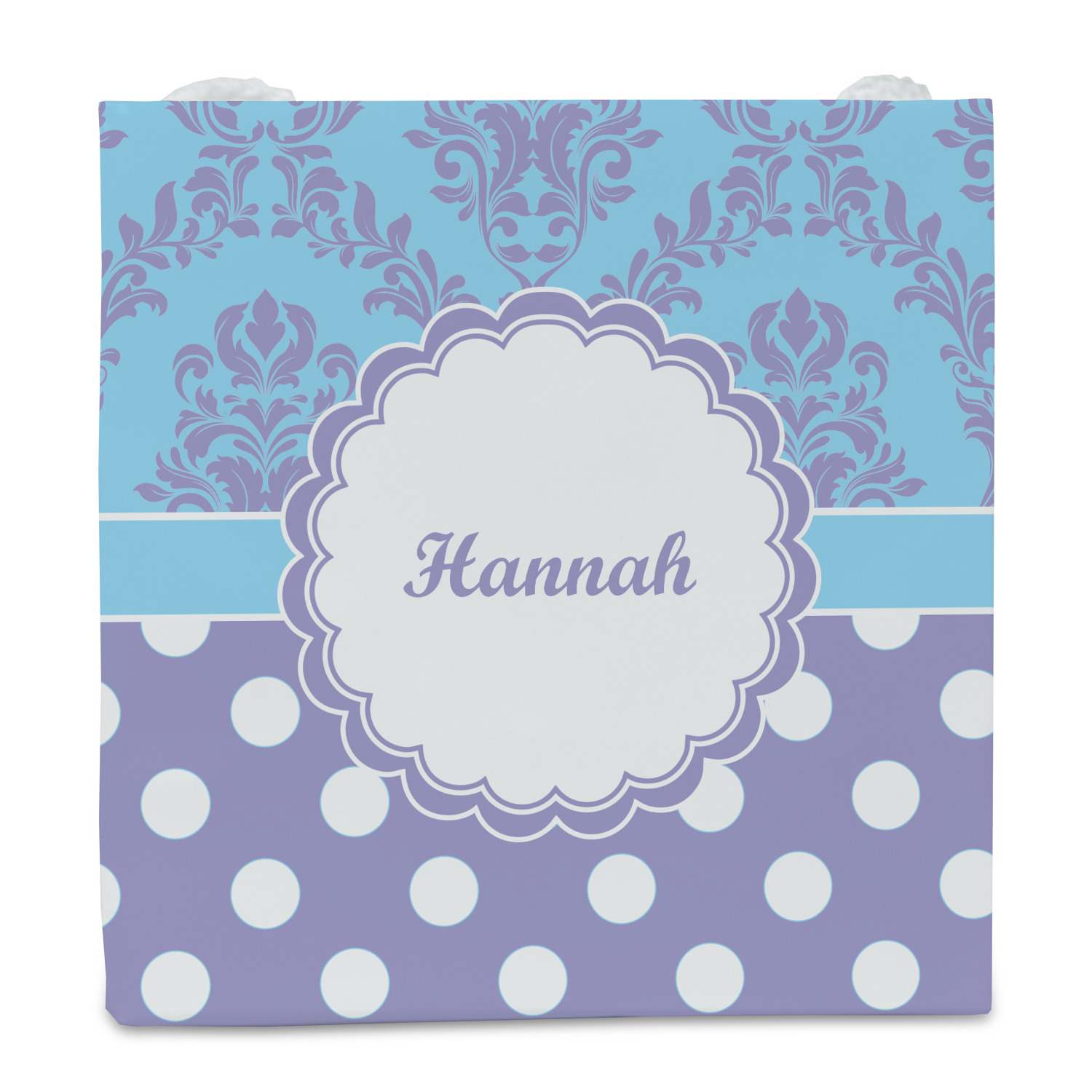 Here is a wonderful damask design with a fun, modern twist. The top of this design features a blue and purple elegant damask. The bottom features a classic design of purple with white polka dots. The two make an adorable combination. The design is completely re-color-able - so you can change any of of the colors and choose from the many many colors in our customization system.