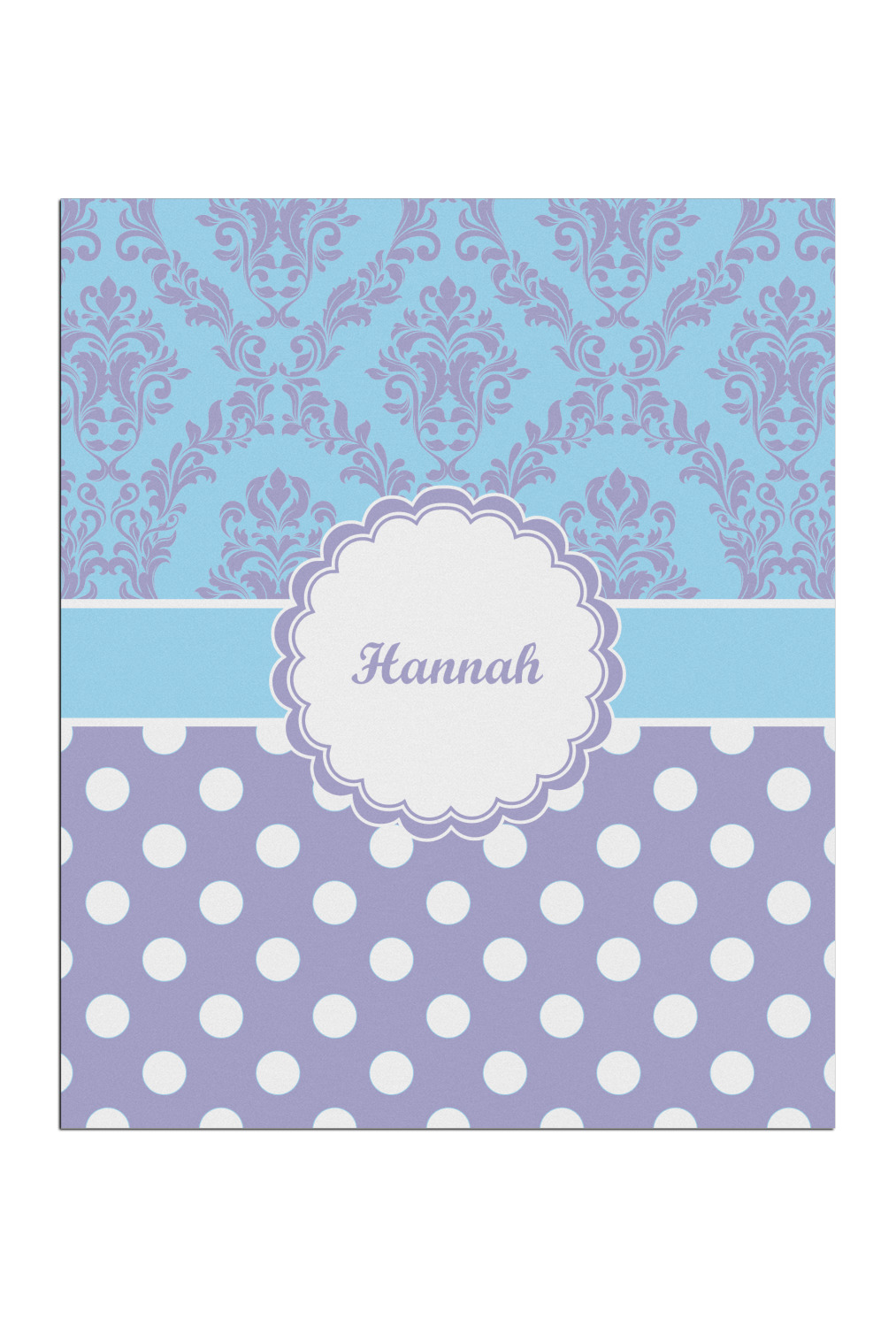 Here is a wonderful damask design with a fun, modern twist. The top of this design features a blue and purple elegant damask. The bottom features a classic design of purple with white polka dots. The two make an adorable combination. The design is completely re-color-able - so you can change any of of the colors and choose from the many many colors in our customization system.