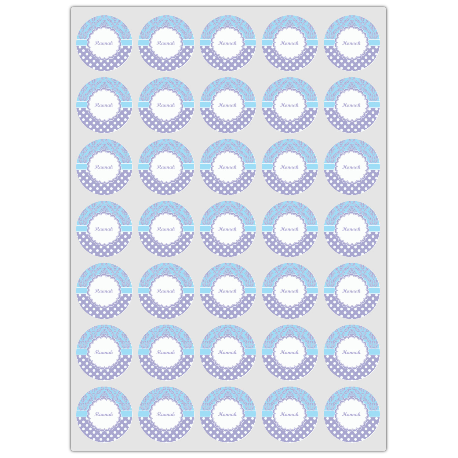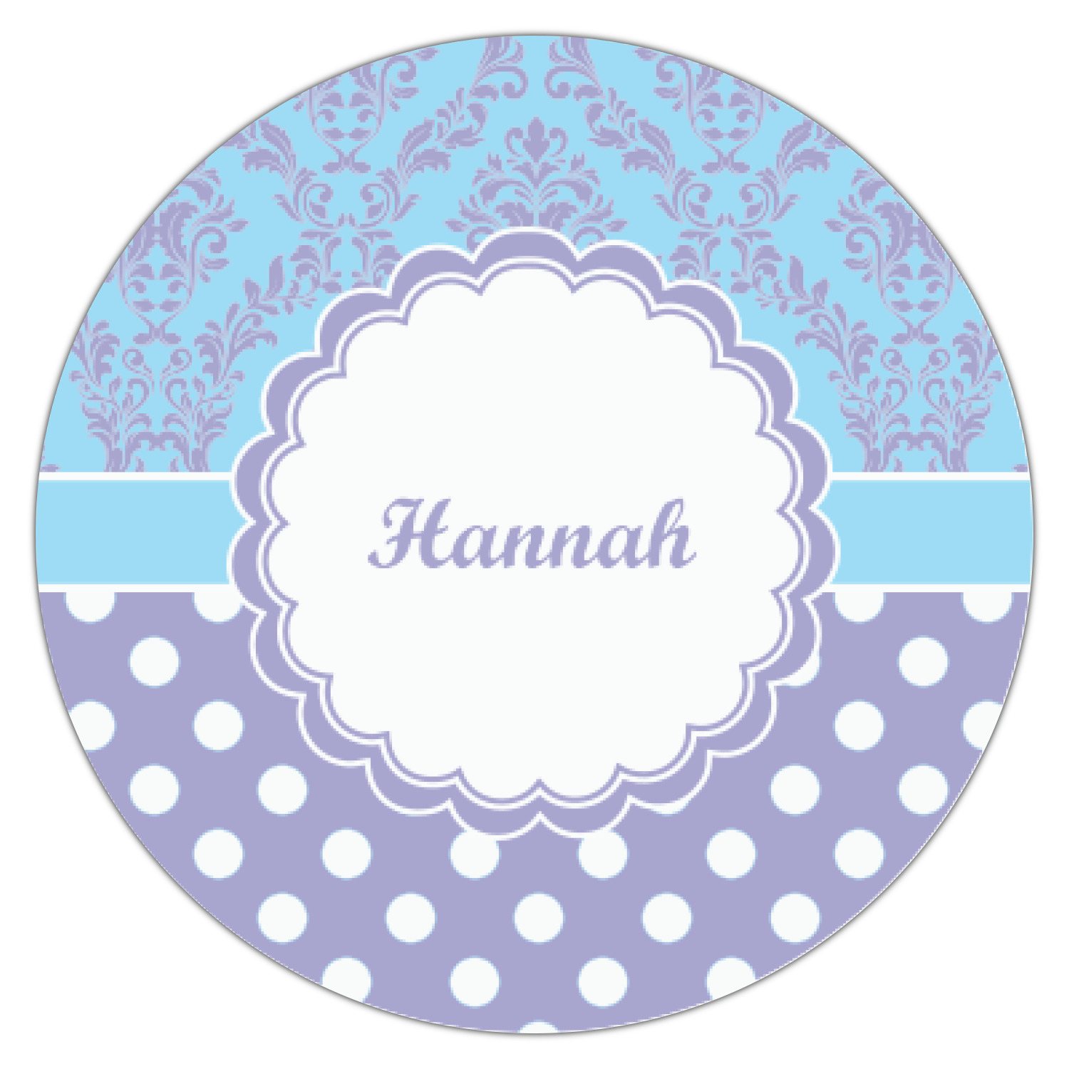 We chose a white & purple scalloped circle label on a baby blue ribbon highlights the name personalization.