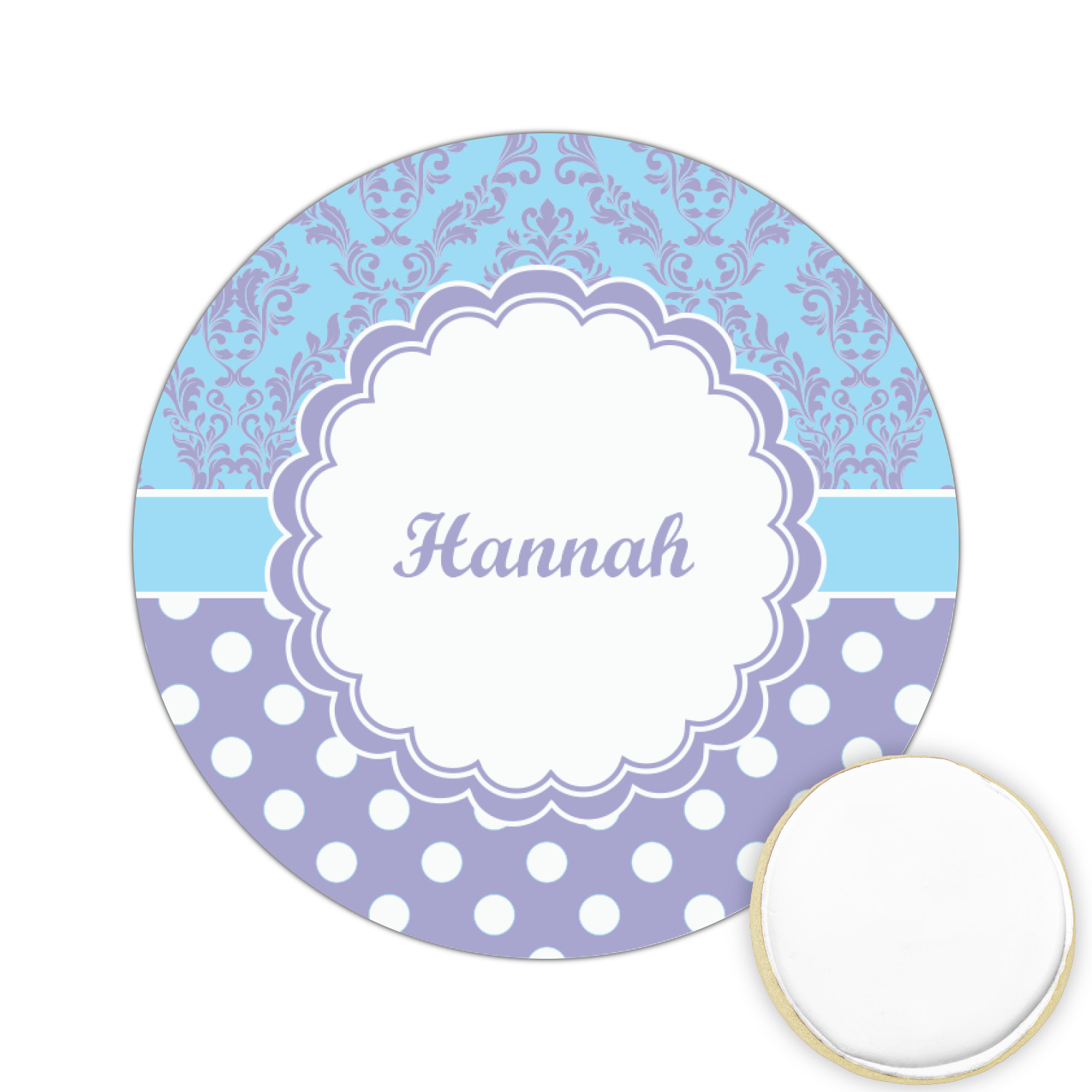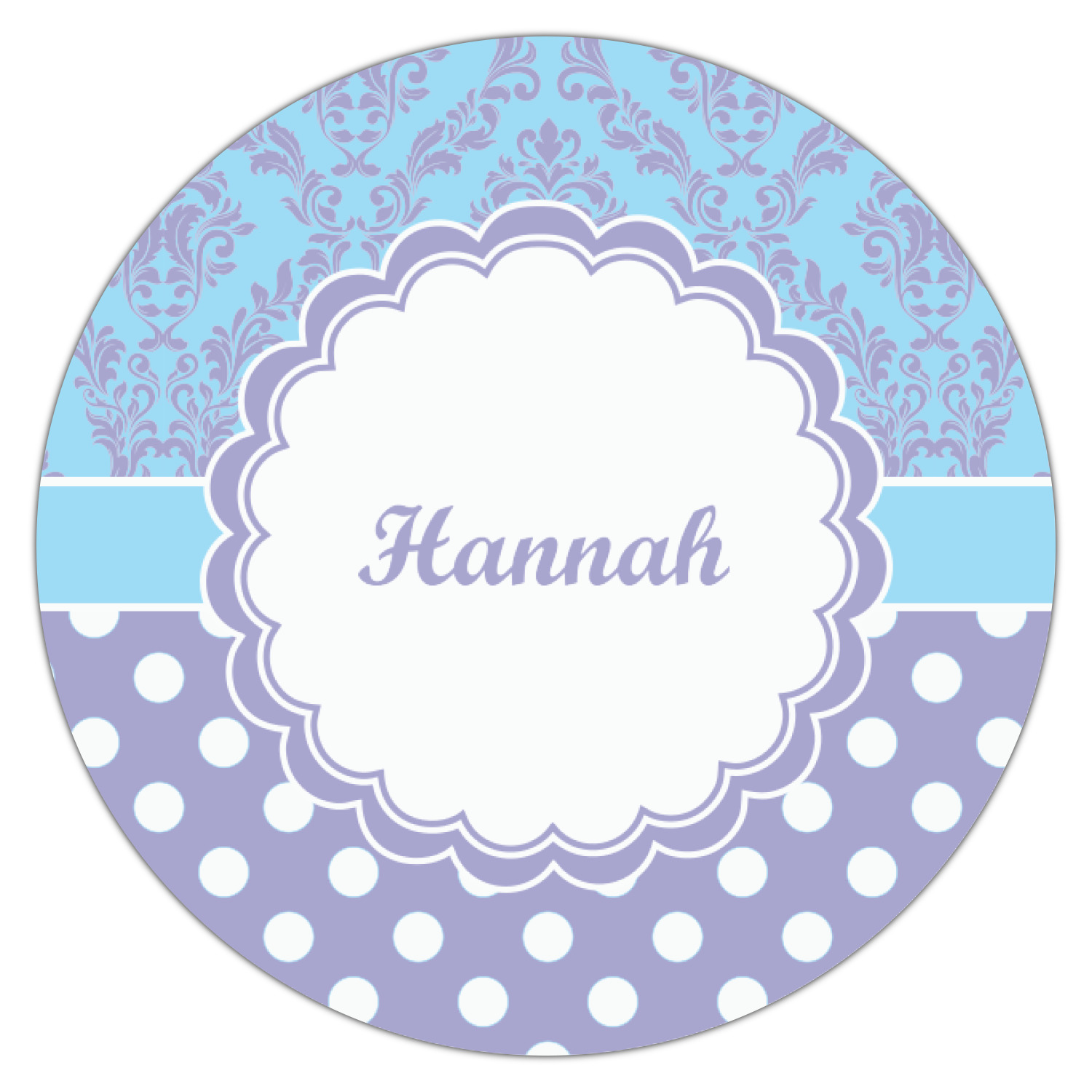 We chose a white & purple scalloped circle label on a baby blue ribbon highlights the name personalization.
