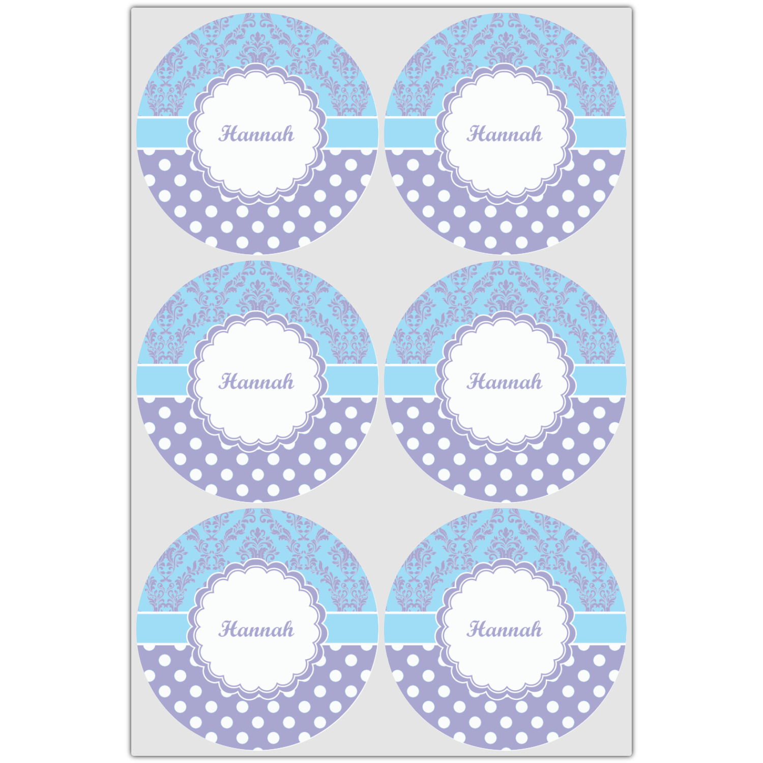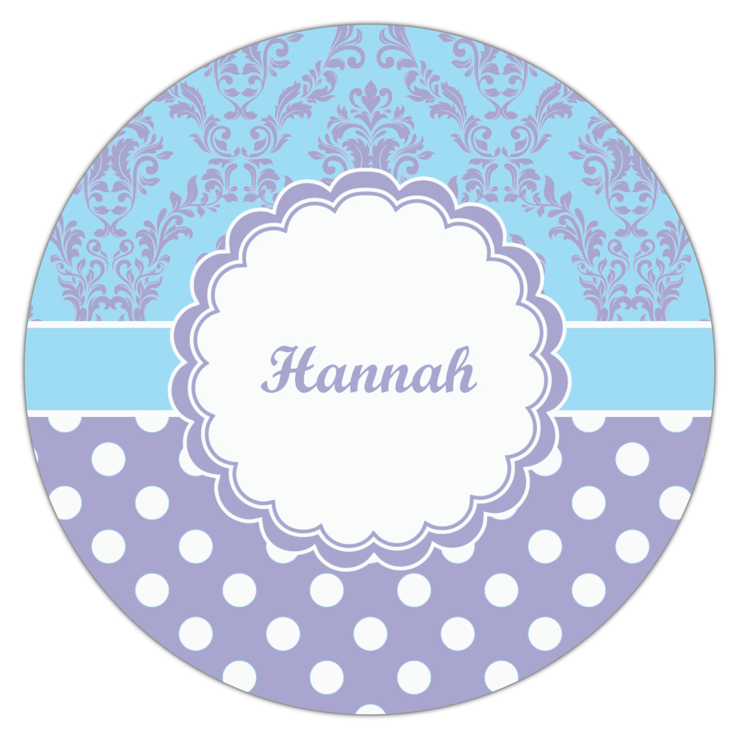 We chose a white & purple scalloped circle label on a baby blue ribbon highlights the name personalization.