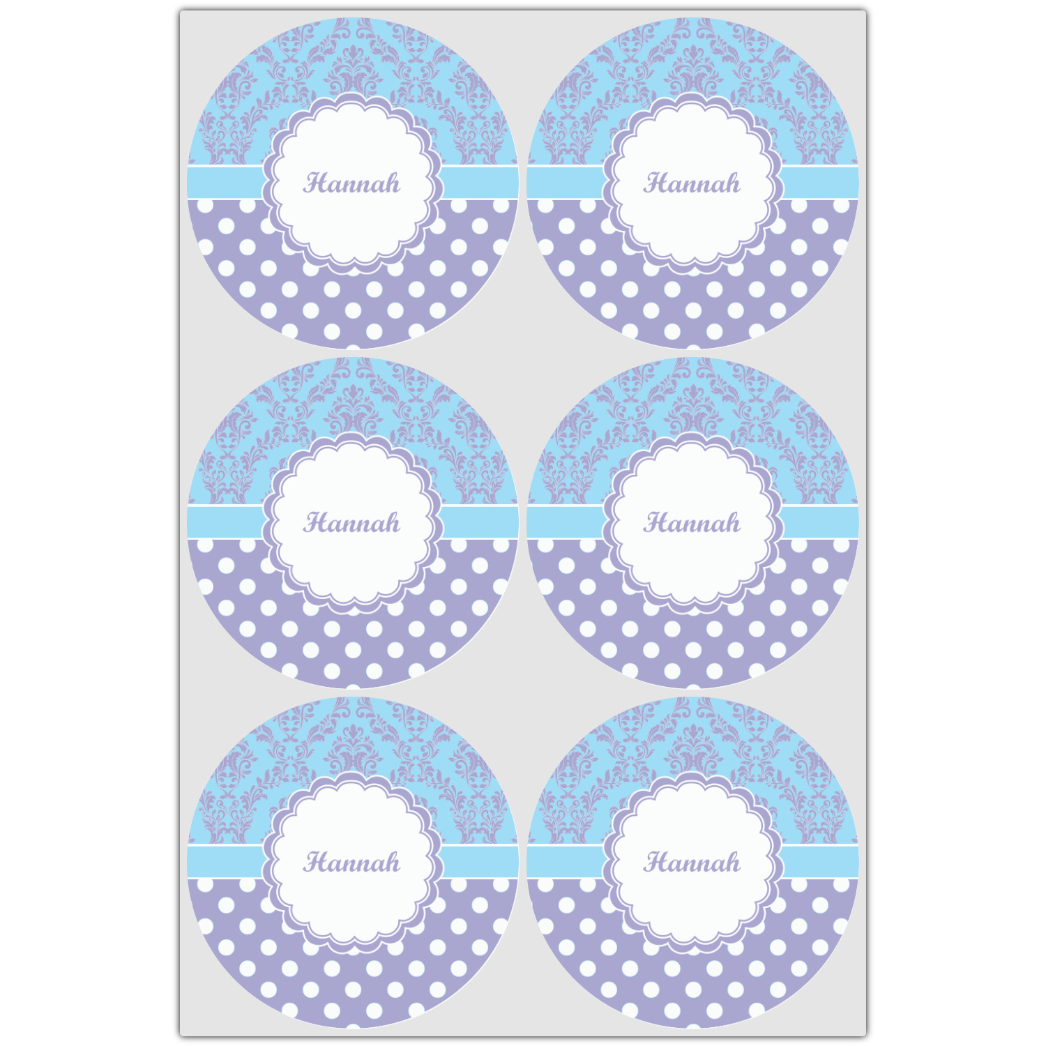 We chose a white & purple scalloped circle label on a baby blue ribbon highlights the name personalization.