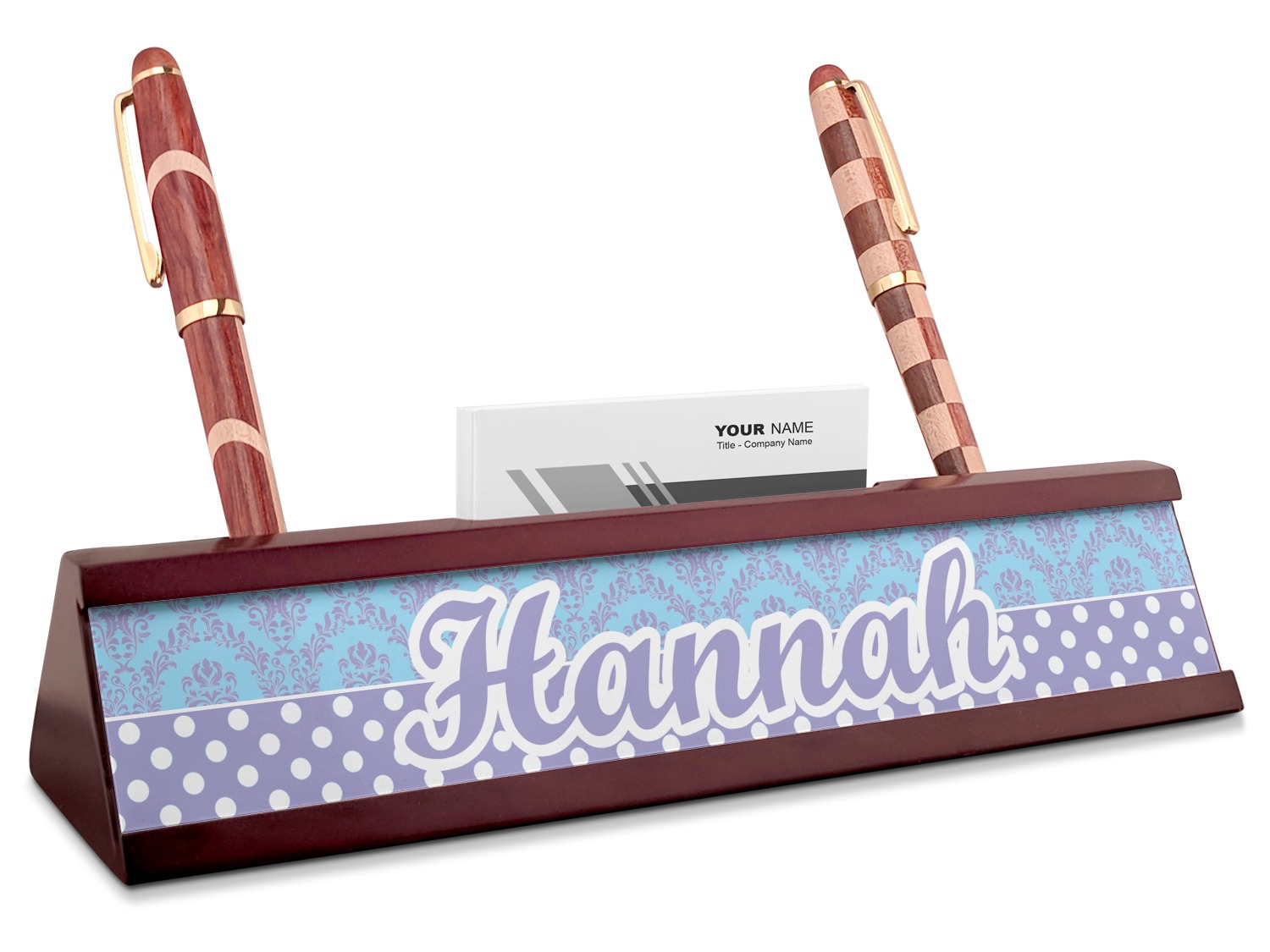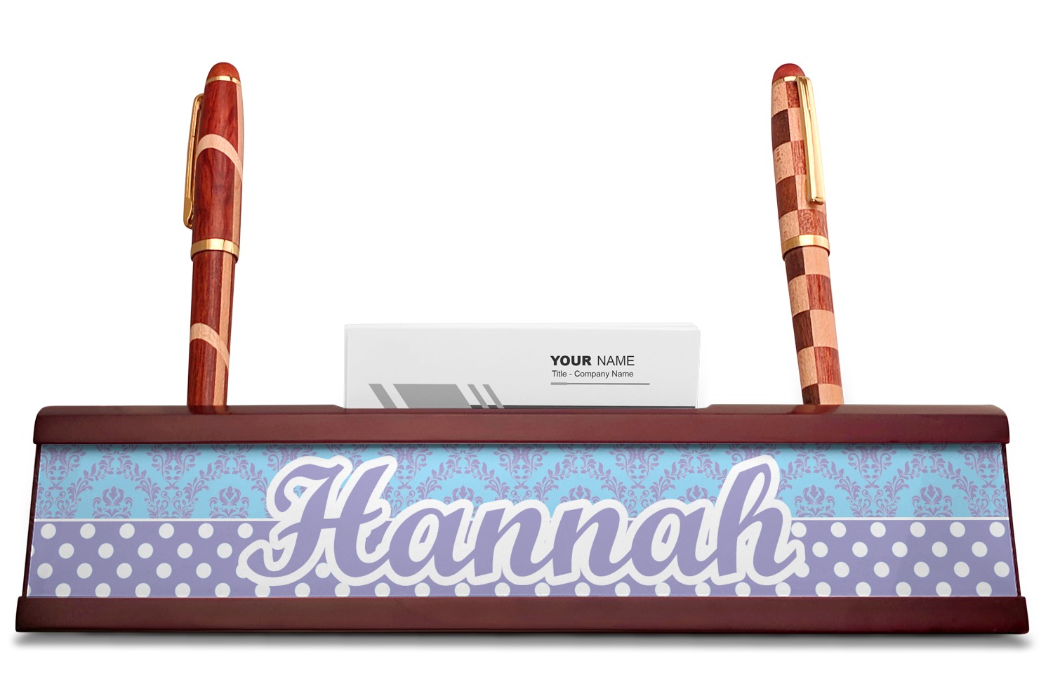 Your desk name plates are crafted from a high-quality, dark-cherry mahogany. At approximately 9.5 by 1.875 by 2.5 inches, this name plaque will fit perfectly, front and center, on your desk. Your customization spans across the entire face of the nameplate. Behind the nameplate lies a skinny slot that can fit approximately 15, traditionally-sized, business cards. You can also store your writing utensils on either side of this custom desk name plate.