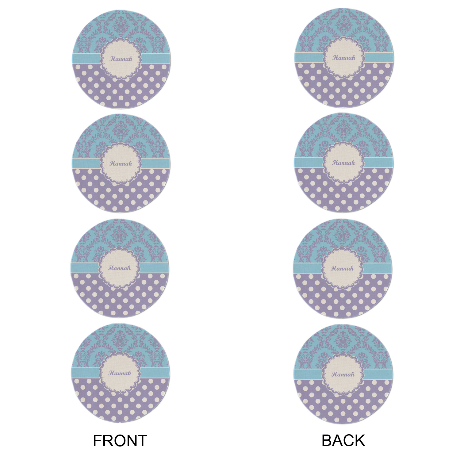 Here is a wonderful damask design with a fun, modern twist. The top of this design features a blue and purple elegant damask. The bottom features a classic design of purple with white polka dots. The two make an adorable combination. The design is completely re-color-able - so you can change any of of the colors and choose from the many many colors in our customization system.