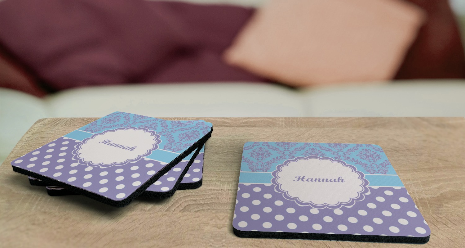 These drink coasters have a smooth, polyester top and a textured, rubber backing on its bottom. The non-slip rubber backing underneath works to keep any spills at bay. At 4 by 4 by 0.25 inches thick, these custom coasters are a suitable size for most drinkware. Your personalization is displayed atop the face of the cup coaster. We sell these rubber coasters in two different shapes: square and round. You can buy each shape as singulars or as a set of 4.