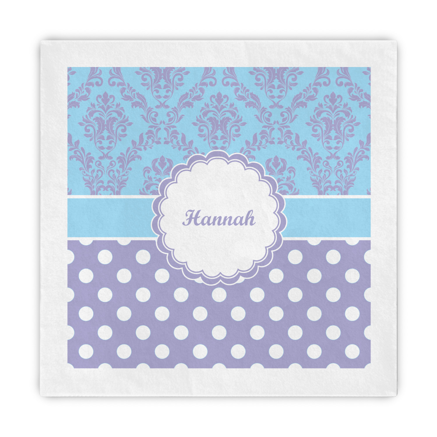 Here is a wonderful damask design with a fun, modern twist. The top of this design features a blue and purple elegant damask. The bottom features a classic design of purple with white polka dots. The two make an adorable combination. The design is completely re-color-able - so you can change any of of the colors and choose from the many many colors in our customization system.