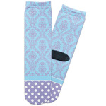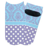 Here is a wonderful damask design with a fun, modern twist. The top of this design features a blue and purple elegant damask. The bottom features a classic design of purple with white polka dots. The two make an adorable combination. The design is completely re-color-able - so you can change any of of the colors and choose from the many many colors in our customization system.