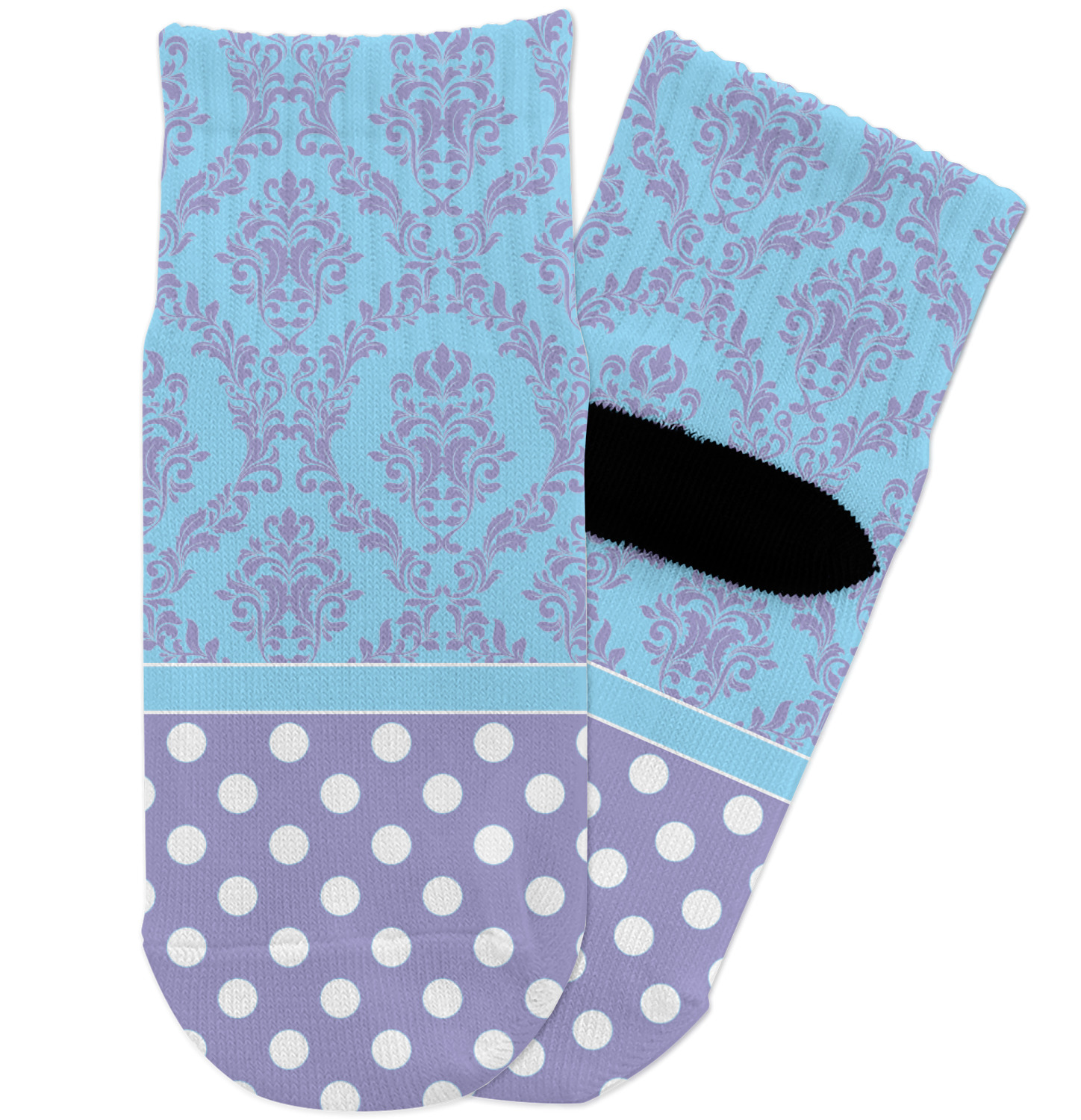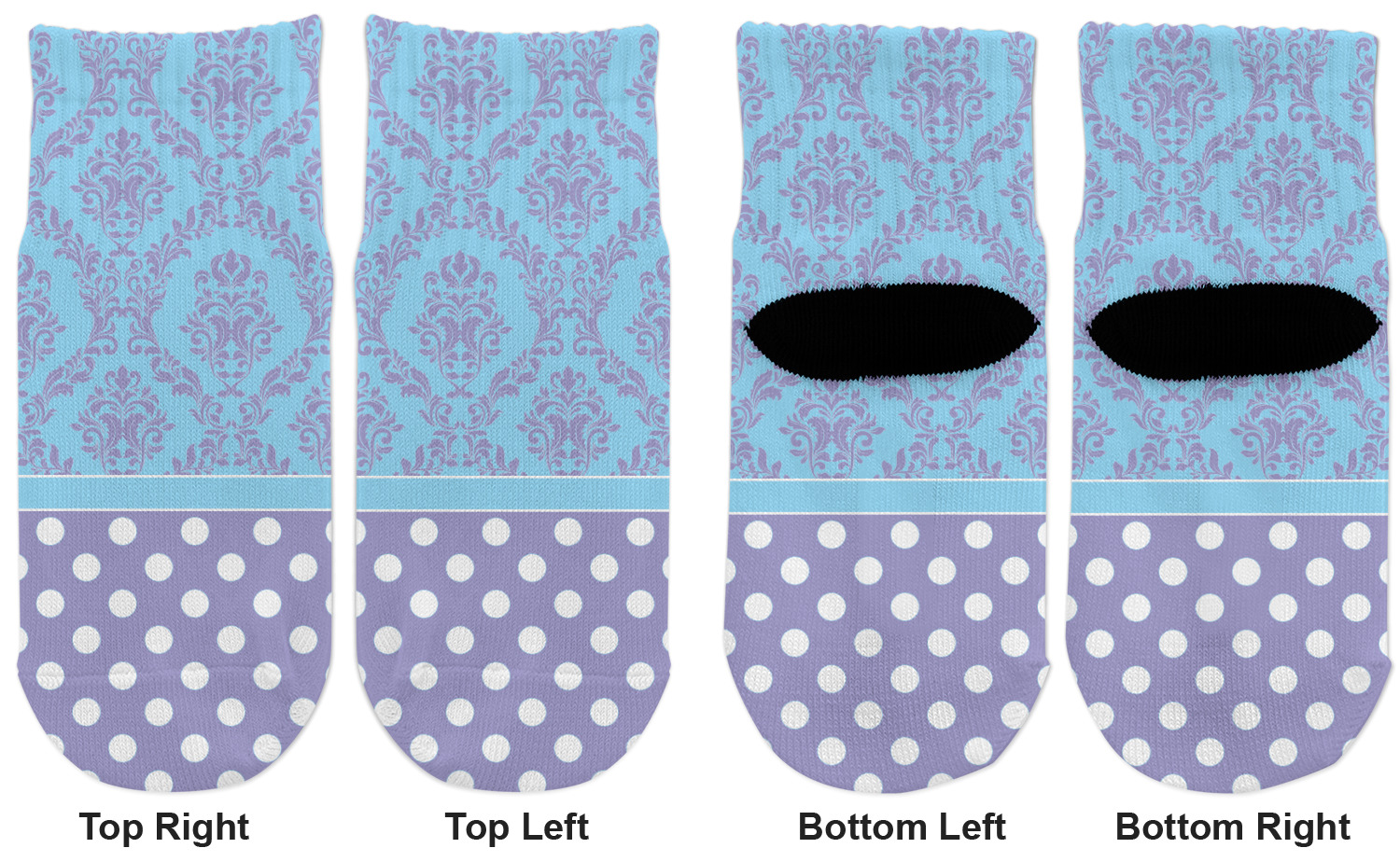 Here is a wonderful damask design with a fun, modern twist. The top of this design features a blue and purple elegant damask. The bottom features a classic design of purple with white polka dots. The two make an adorable combination. The design is completely re-color-able - so you can change any of of the colors and choose from the many many colors in our customization system.