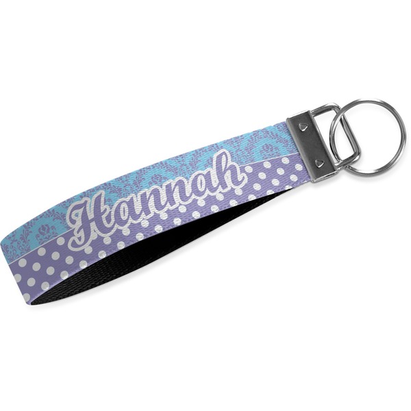 These key fob keychains are made from a polyester weave, right here in the USA. They feature a silver, metal clasp, attached to a round keyring. The piece gives the personalized wristlet a beautiful, finished look. Your customized design is printed on the outside of the keychain strap. We carry these wristlets in two sizes: small, which is 5 inches in width, and large, which is 5.5 inches in width.