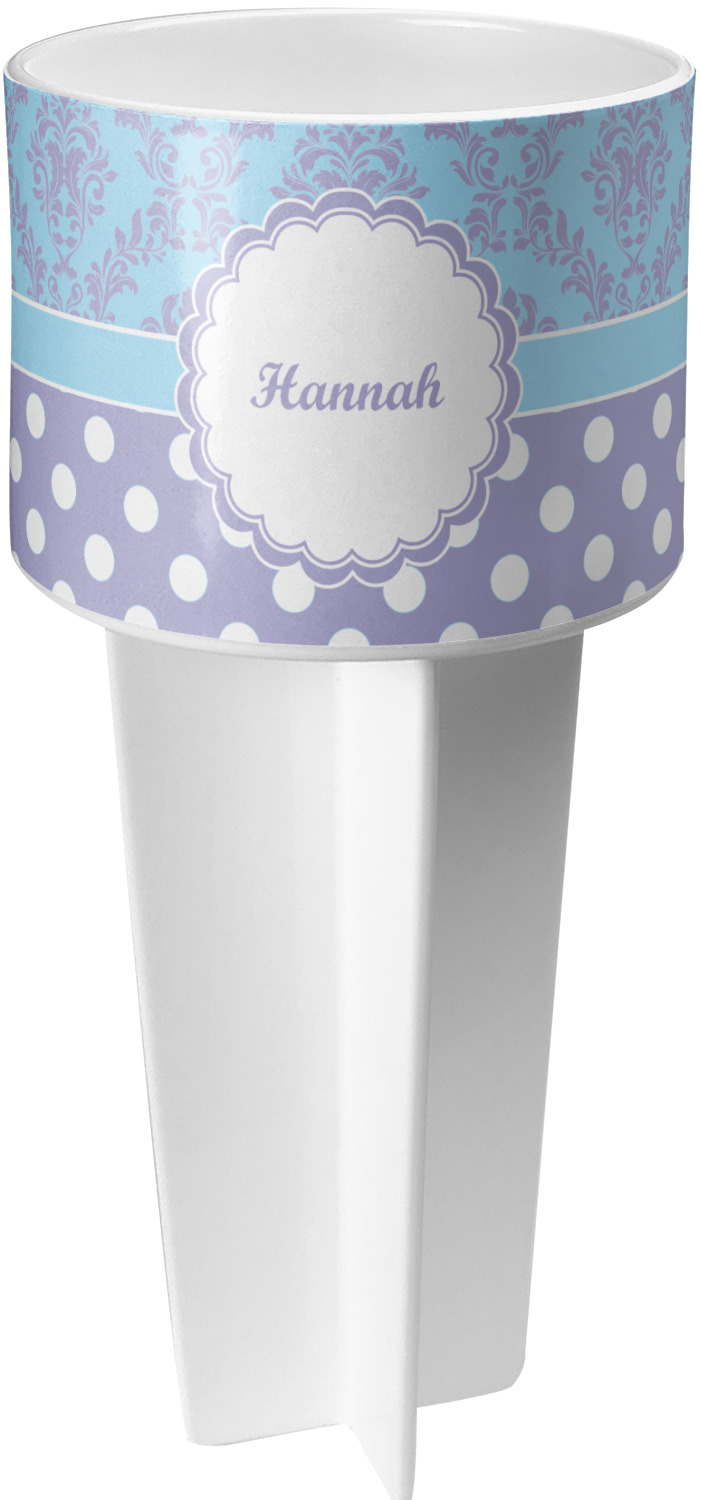 We chose a white & purple scalloped circle label on a baby blue ribbon highlights the name personalization.