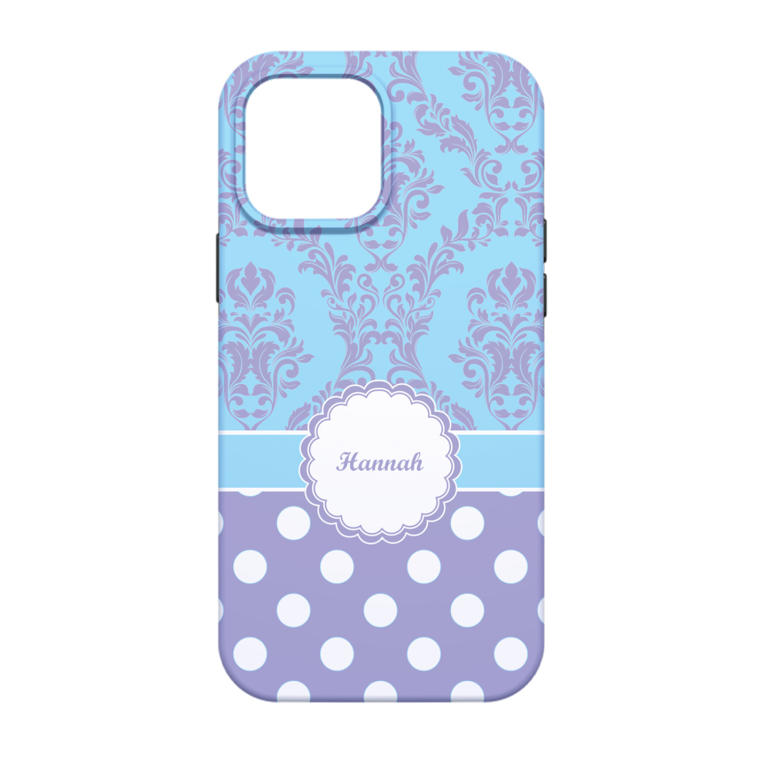 Here is a wonderful damask design with a fun, modern twist. The top of this design features a blue and purple elegant damask. The bottom features a classic design of purple with white polka dots. The two make an adorable combination. The design is completely re-color-able - so you can change any of of the colors and choose from the many many colors in our customization system.