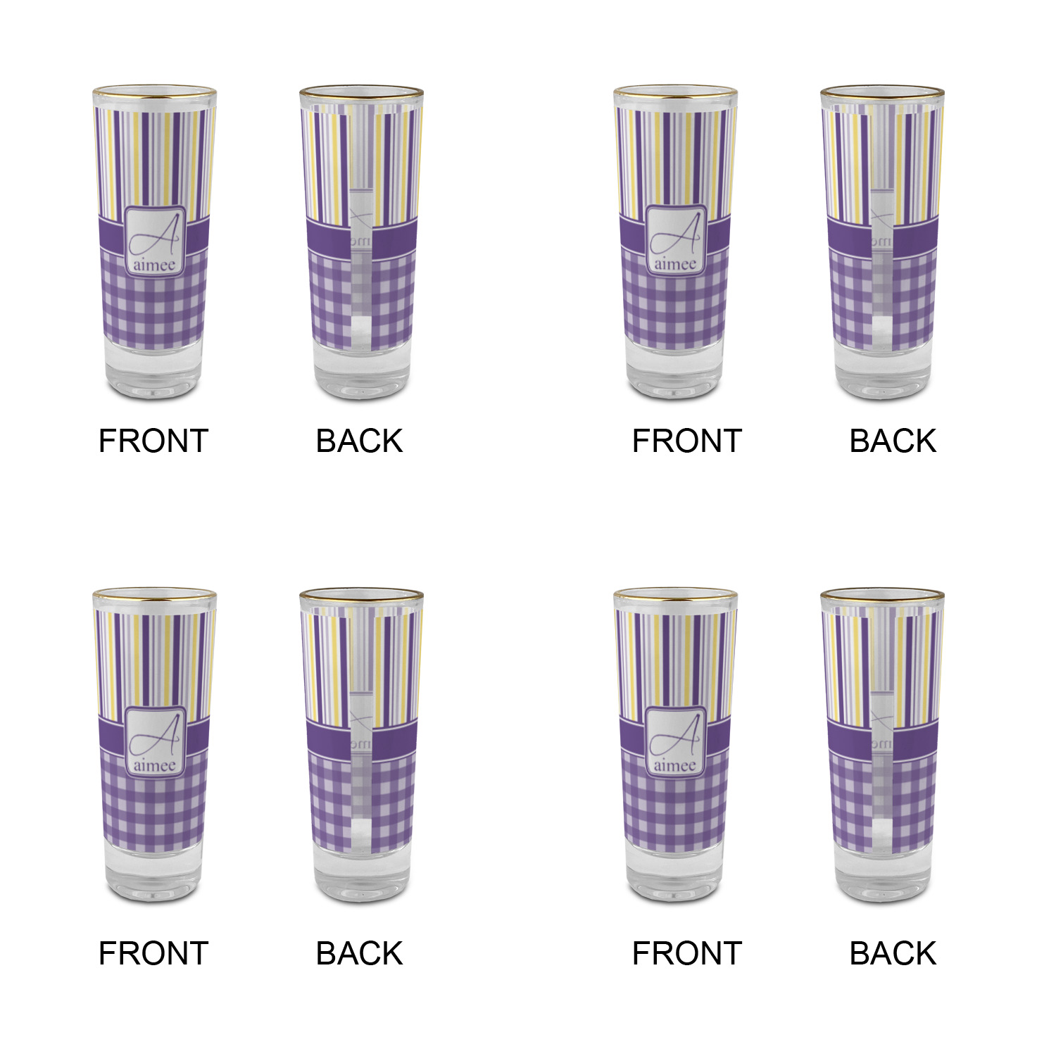 These glass shooter glasses are printed in full color with the design of your choice. These are a tall shooter 2 oz size and stand 4" tall. The print is a full wrap design to boldly display your personalization.