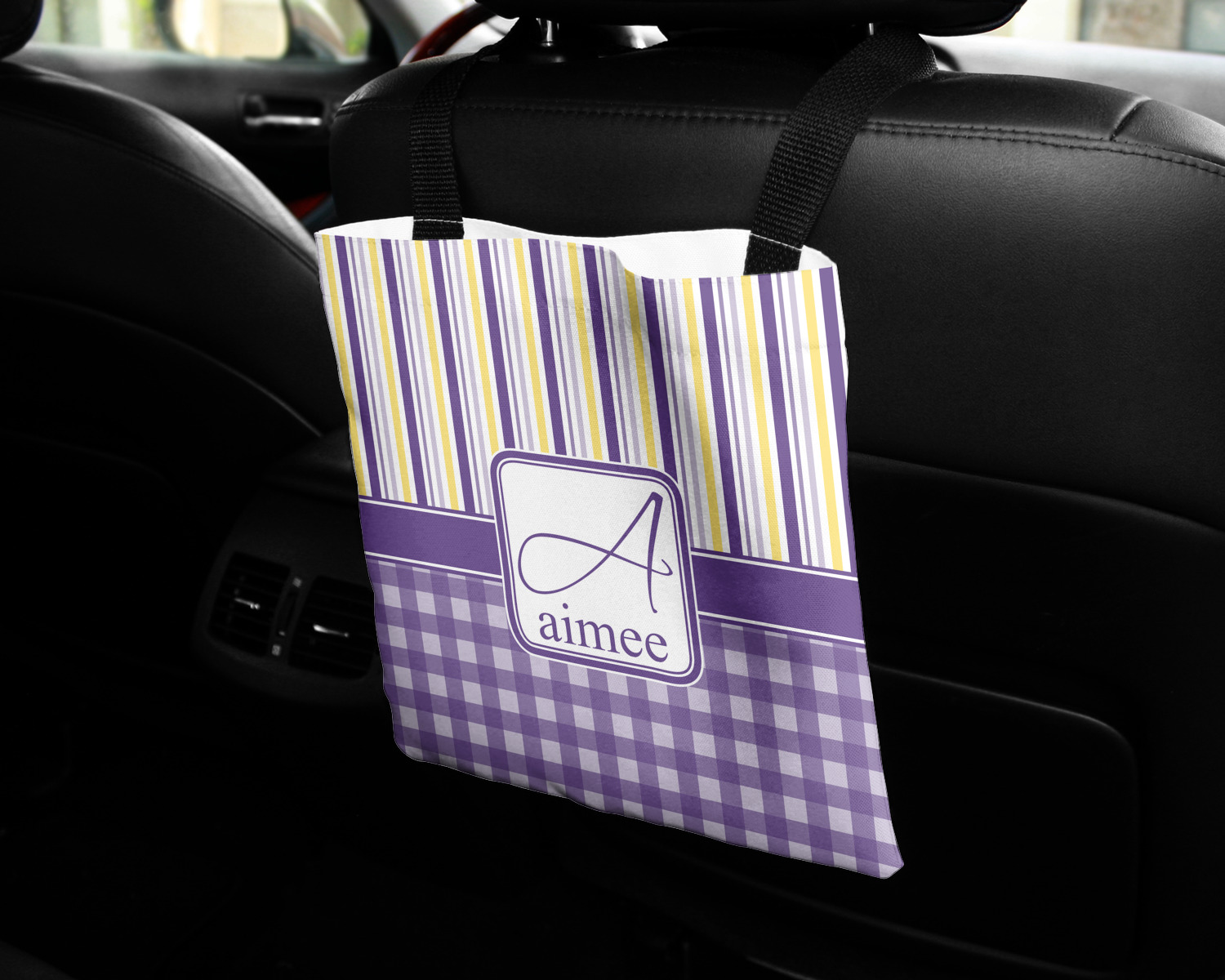 These car back seat organizers are sturdy tote-like bags, fabricated from a robust polyester, and features a single handle on the back side. The strap features an attachable velcro for easy attachment to headrests, grocery carts, car seats, and more. Simply undo the velcro, loop the strap around the headrest, reattach the velcro, and let the organizer hang from the front seat. These car organizers are the perfect means of increasing your backseat's legroom, while storing multiple items in one place for better accessibility. Each car back seat organizer measures at 10 by 10 inches, and features your personalized design printed across its front and back.